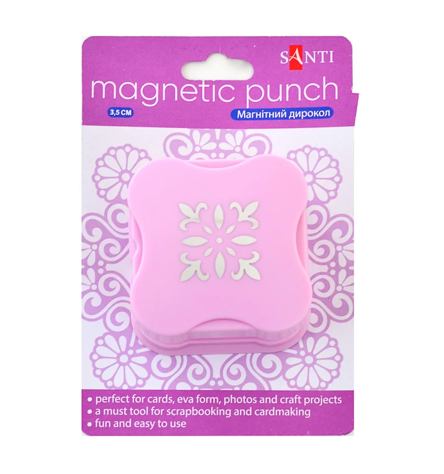 Дырокол магнитный с узором, диагональ 3,5 см. Магнитная система дырокола позволяет разместить декоративный элемент в любом месте страницы, а вырезанные частички могут быть использованы как элементы декора. Дырокол состоит из 2 половинок, включающих магнит. Диагональ высечки: 3,5 см. Рекомендуется использовать бумагу толщиной до 220 г/м .Материал: пластик, цинк.