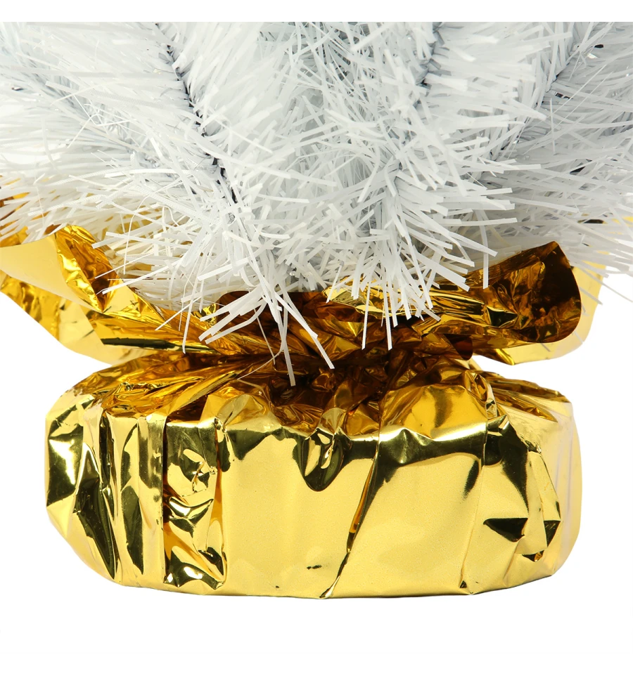 Искусственная ёлка выполнена из качественной ПВХ-плёнки с густой хвоей белого цвета, напоминающей заснеженные таёжные ветви. Аккуратная форма и плотное расположение ярусов придают композиции естественный и опрятный вид. Ёлка установлена на устойчивый деревянный пенёк, обтянутый декоративной золотой фольгой, что делает её завершённым и нарядным элементом новогоднего декора.