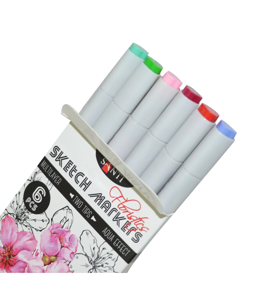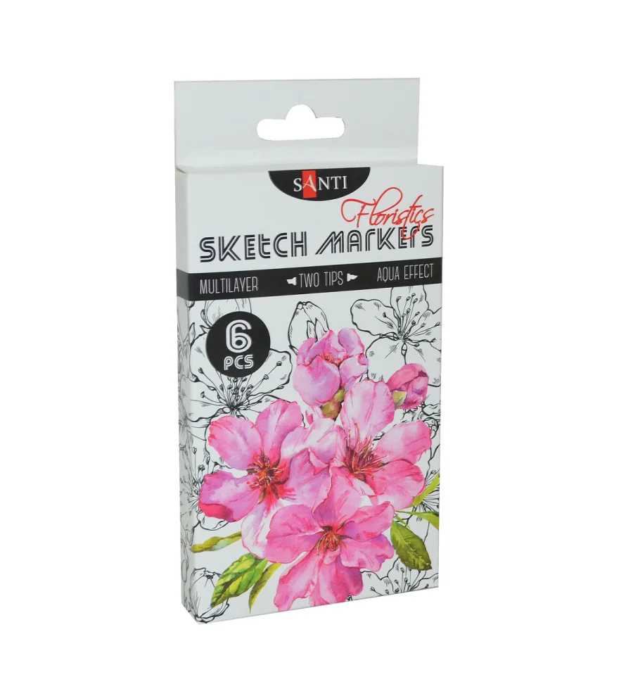 Скетч-маркеры SANTI — это безграничные возможности для ваших рисунков! Тематический набор "Floristics" состоит из 6 оттенков для изображения розовых флористических мотивов и сочной зелени. Водорастворимые, светостойкие чернила предназначены для живописи и рисования в смешанных техниках. Совмещают в себе свойства маркеров и акварельных красок. Для достижения акварельного эффекта можно размыть детали рисунка при помощи смоченной водой кисти на самой бумаге или разбавить водой чернила на палитре. Оснащены двумя видами наконечников: мягкая кисть для точной детализации рисунка и долото - для заполнения больших фрагментов. Для работы можно использовать акварельную бумагу или специальную бумагу для рисования маркерами. Состав набора: 014 пурпурно-красный, 026 алый, 028 светло-розовый, 029 сиреневый, 030 малахит, 011 светло-зеленый.