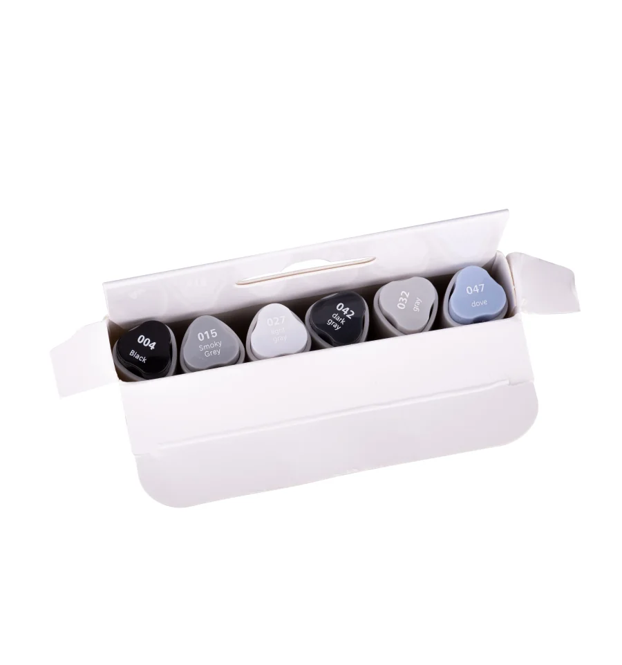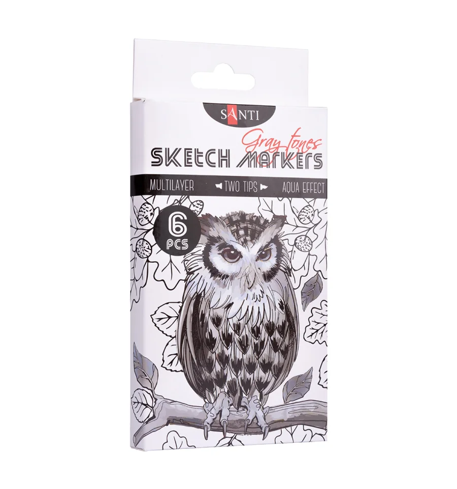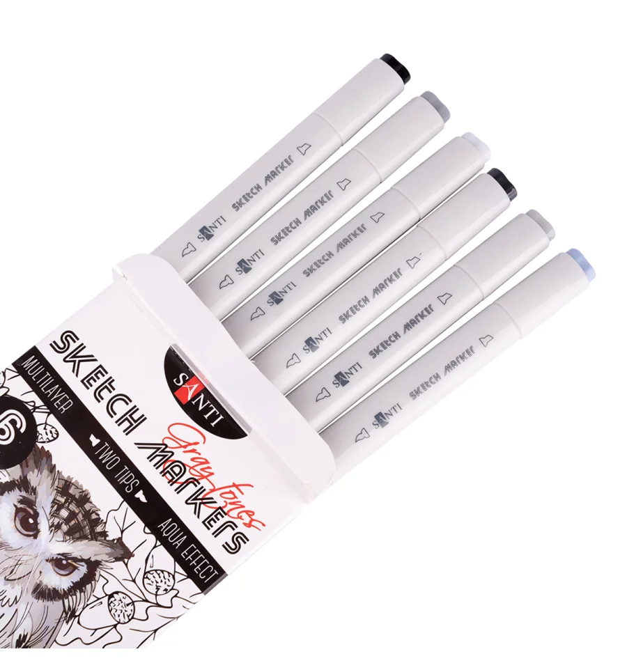 Скетч-маркеры SANTI — это безграничные возможности для ваших рисунков! Тематический набор "Gray Tones" из 6 маркеров поможет идеально детализировать скетчи, выполненные в оттенках серого цвета. Водорастворимые, светостойкие чернила предназначены для живописи и рисования в смешанных техниках. Совмещают в себе свойства маркеров и акварельных красок. Для достижения акварельного эффекта можно размыть детали рисунка при помощи смоченной водой кисти на самой бумаге или разбавить водой чернила на палитре. Оснащены двумя видами наконечников: мягкая кисть для точной детализации рисунка и долото - для заполнения больших фрагментов. Для работы можно использовать акварельную бумагу или специальную бумагу для рисования маркерами.Состав набора: 047 сизый, 032 серый, 042 темно-серый, 027 светло-серый, 015 дымчато-серый, 004 чёрный