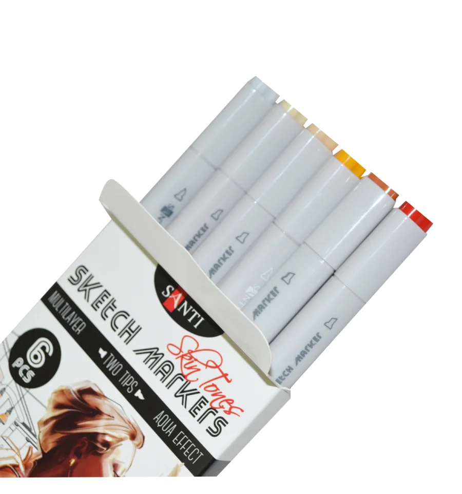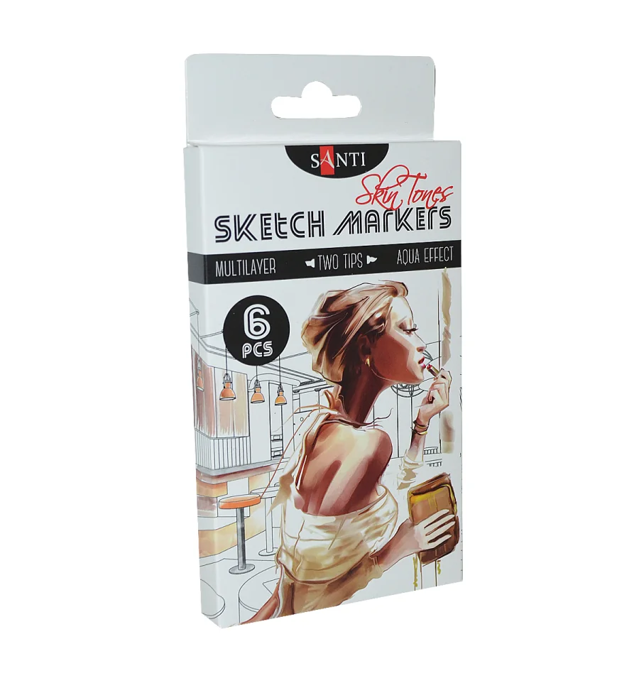 Скетч-маркеры SANTI — это безграничные возможности для ваших рисунков! Тематический набор "Skin Tones" состоит из 6 оттенков, которые идеально подходят для рисования портретов. Водорастворимые, светостойкие чернила предназначены для живописи и рисования в смешанных техниках. Совмещают в себе свойства маркеров и акварельных красок. Для достижения акварельного эффекта можно размыть детали рисунка при помощи смоченной водой кисти на самой бумаге или разбавить водой чернила на палитре. Оснащены двумя видами наконечников: мягкая кисть для точной детализации рисунка и долото - для заполнения больших фрагментов. Для работы можно использовать акварельную бумагу или специальную бумагу для рисования маркерами. Состав набора: 023 айвори, 024 светло-телесный, 017 темно желтый, 025 сиена, 026 алый, 027 светло-серый