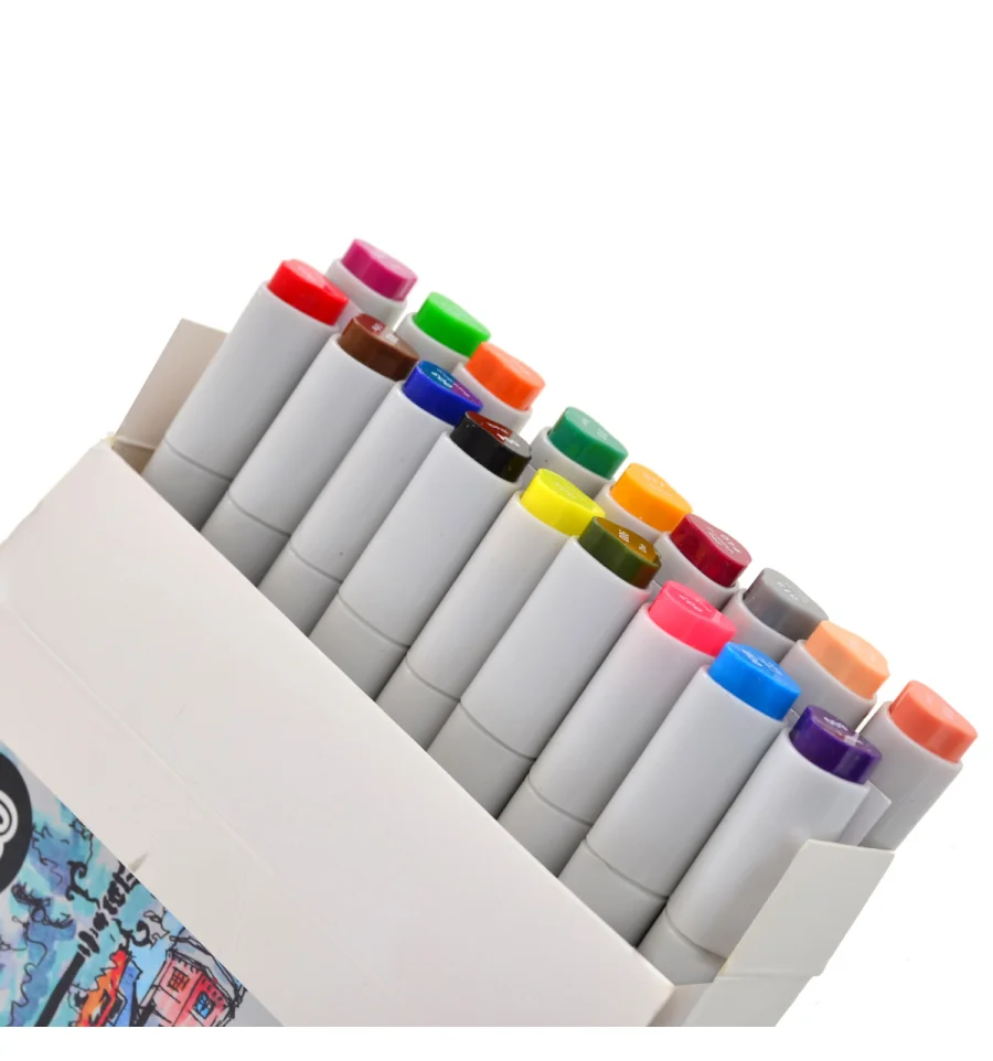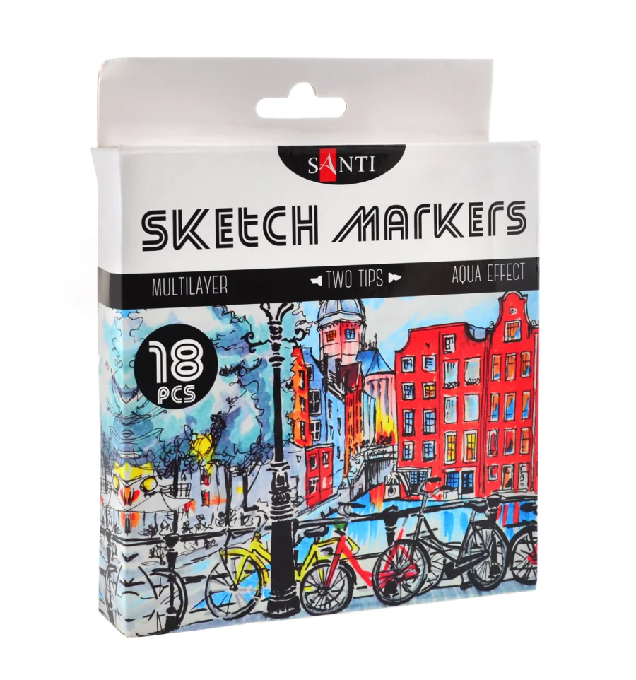 Скетч-маркеры SANTI — это безграничные возможности для ваших рисунков! Удобный набор из 18 маркеров базовых оттенков пригодится для рисования на пленэре или в путешествии. Водорастворимые, светостойкие чернила предназначены для живописи и рисования в смешанных техниках. Совмещают в себе свойства маркеров и акварельных красок. Для достижения акварельного эффекта можно размыть детали рисунка при помощи смоченной водой кисти на самой бумаге или разбавить водой чернила на палитре. Оснащены двумя видами наконечников: мягкая кисть для точной детализации рисунка и долото - для заполнения больших фрагментов. Для работы можно использовать акварельную бумагу или специальную бумагу для рисования маркерами.