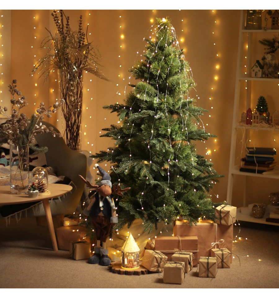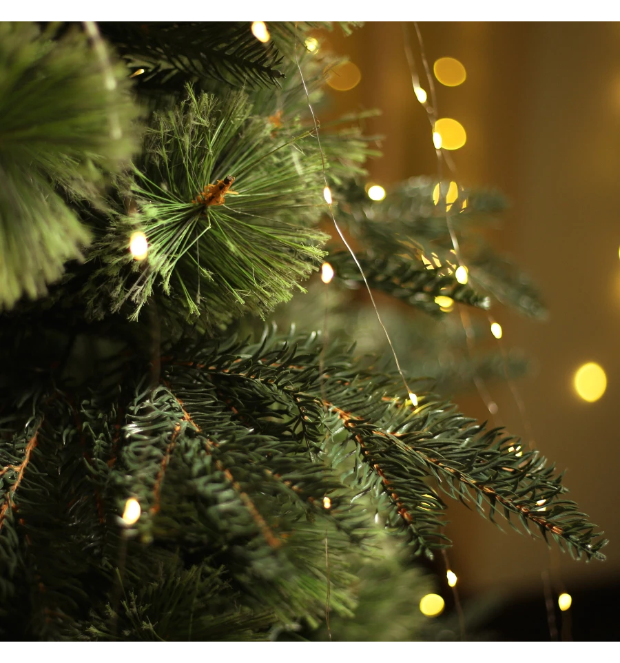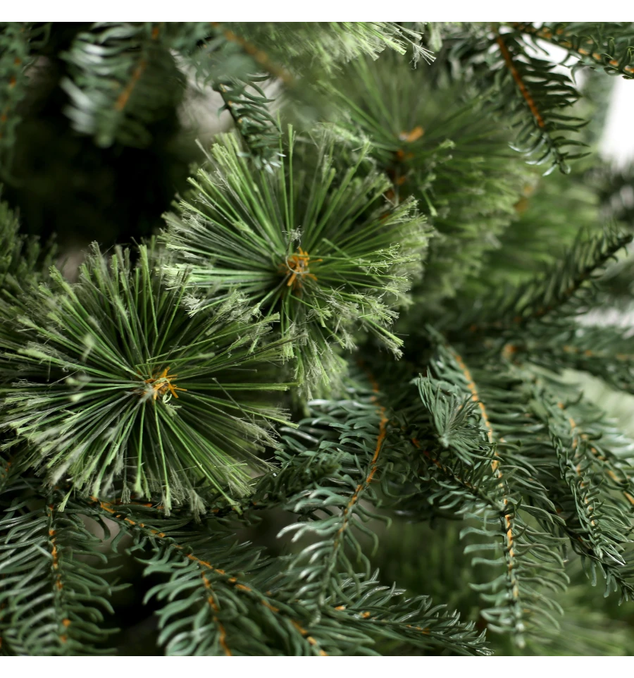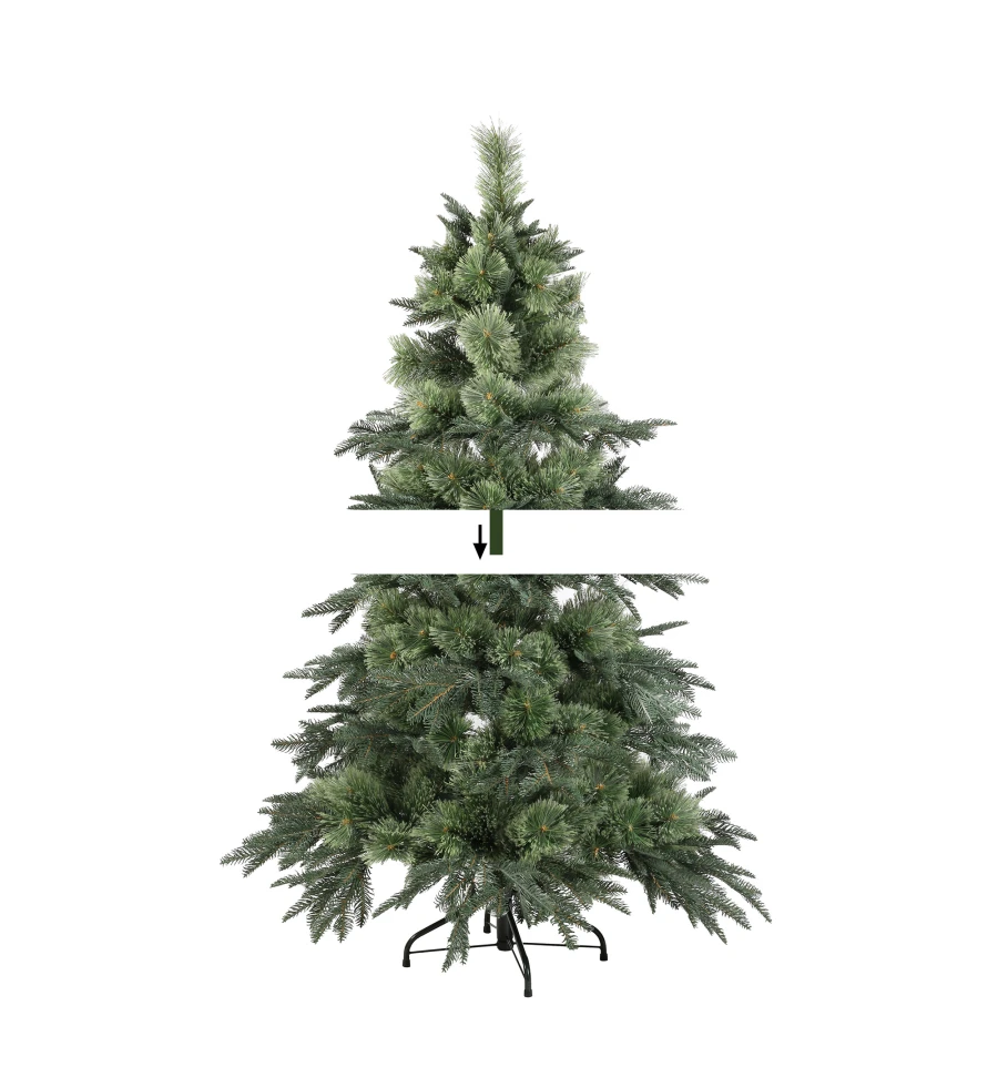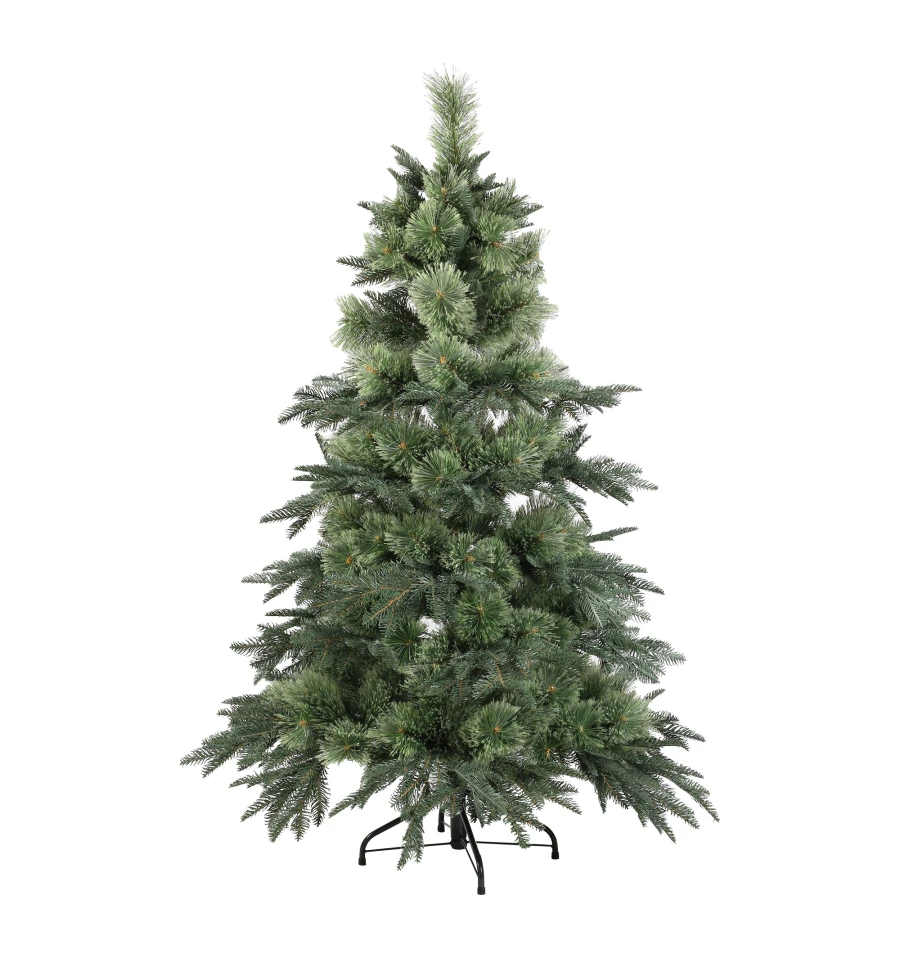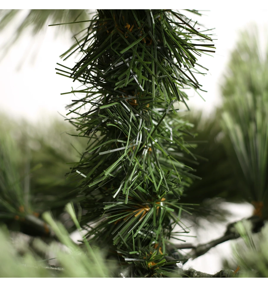 Искусственная сосна подобна натуральному дереву, растущему в живой природе. Все используемые материалы экологически чистые, имеют противопожарные свойства. Большим плюсом искусственной сосны является её долговечность, а сборка конструкции не отнимет много времени. Красивое и пышное новогоднее дерево будет ежегодно наполнять дом радостью и благополучием в рождественский период. Материал: ПВХ пленка шириной 10 см; металл; проволока. Высота: 150 см. Диаметр нижнего ряда: 97 см. Ствол состоит из двух частей. Подставка сосны — это металлическая крестовина с болтами, закрепляющими ствол. Габариты: 1,50 м.