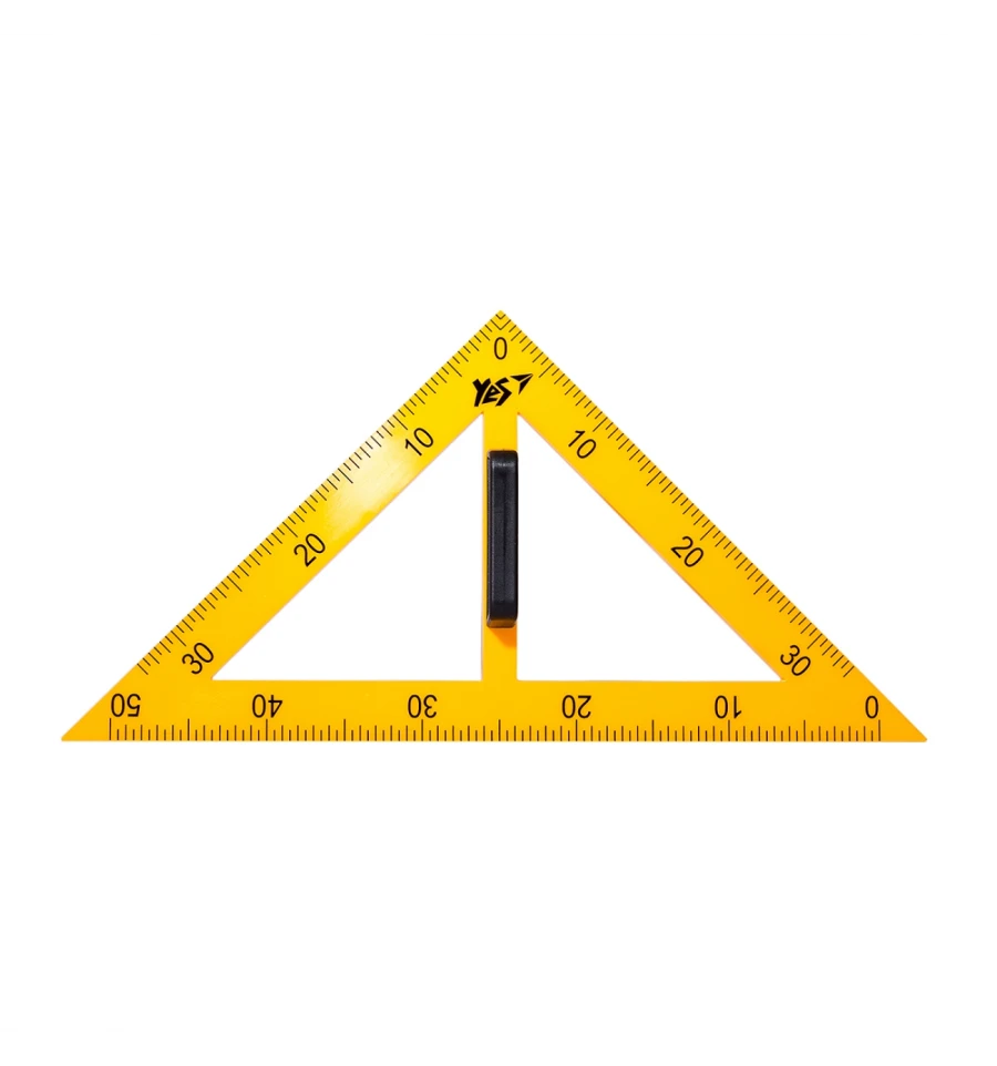 Треугольник 90/45/45 с держателем. Измерительная шкала с делением в 1 см и цифровым обозначением каждые 5 см. Длина сторон - 35 см. Предназначен для чертежных и измерительных работ на досках. Изготовлен из пластика.