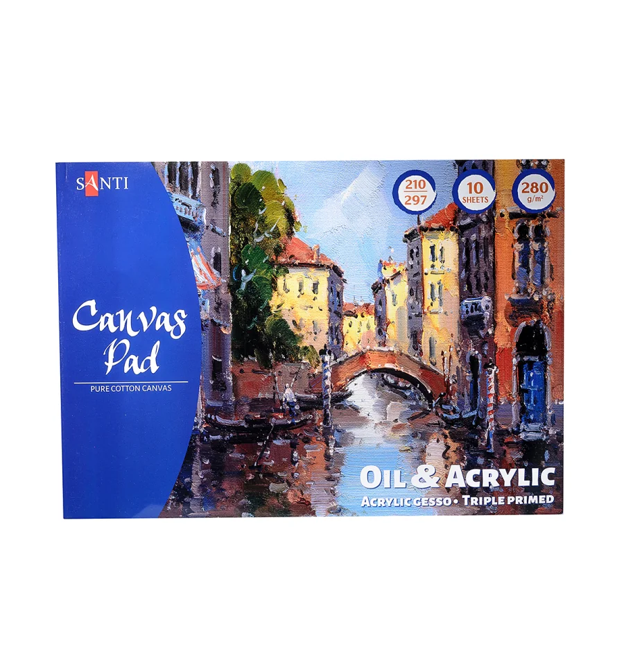 Хлопковый холст от бренда "SANTI" имеет мелкозернистую текстуру и обработан акриловым грунтом в три слоя. Идеально подходит для живописи акриловыми и масляными красками. Альбом проклеен по узкой стороне и имеет подложку из плотного картона. Плотность холста 280 г/м2. Размер А4 (210*297 мм), 10 листов.