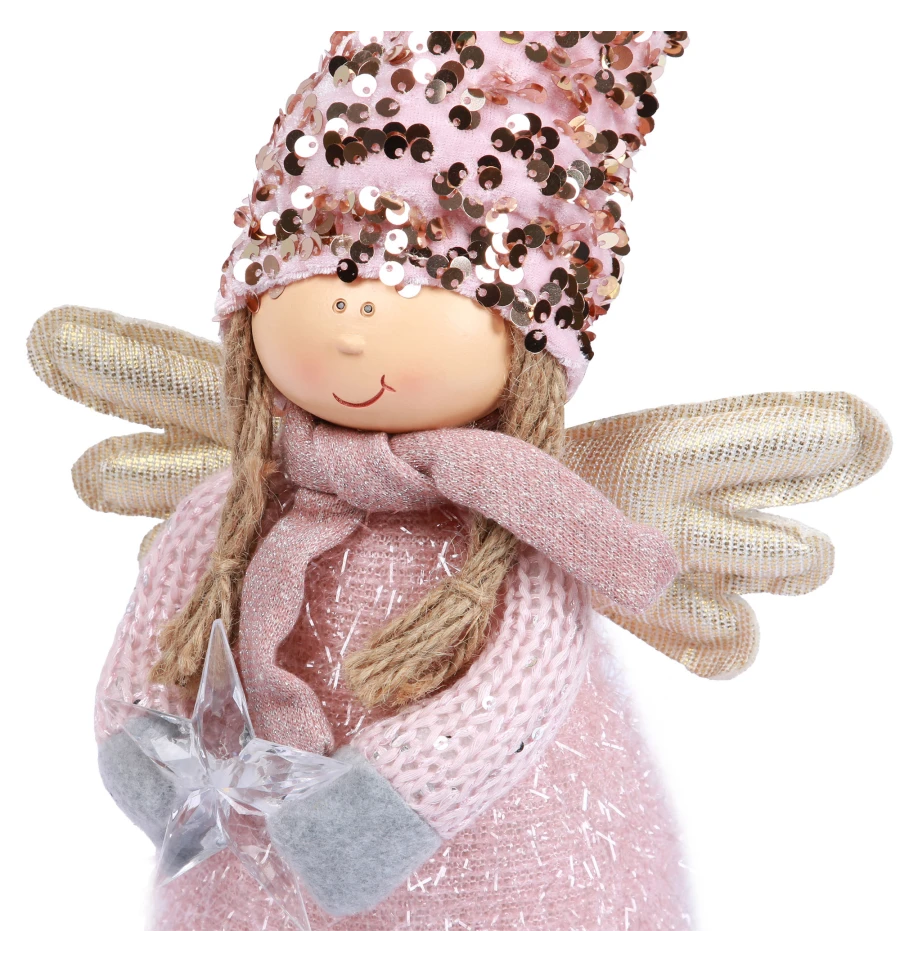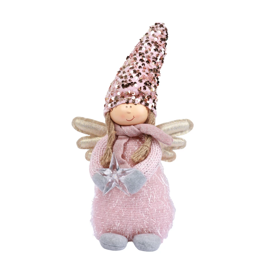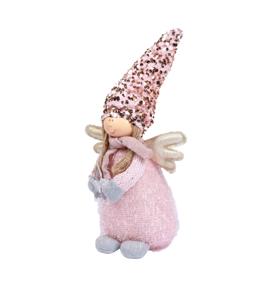Очаровательный ангел в розовом платьице, в сверкающем колпачке с пайетками и с нежными золотистыми крылышками станет прекрасным украшением для гостиной, спальни, детской, камина или праздничной композиции.