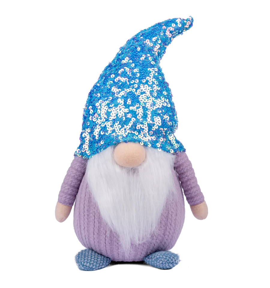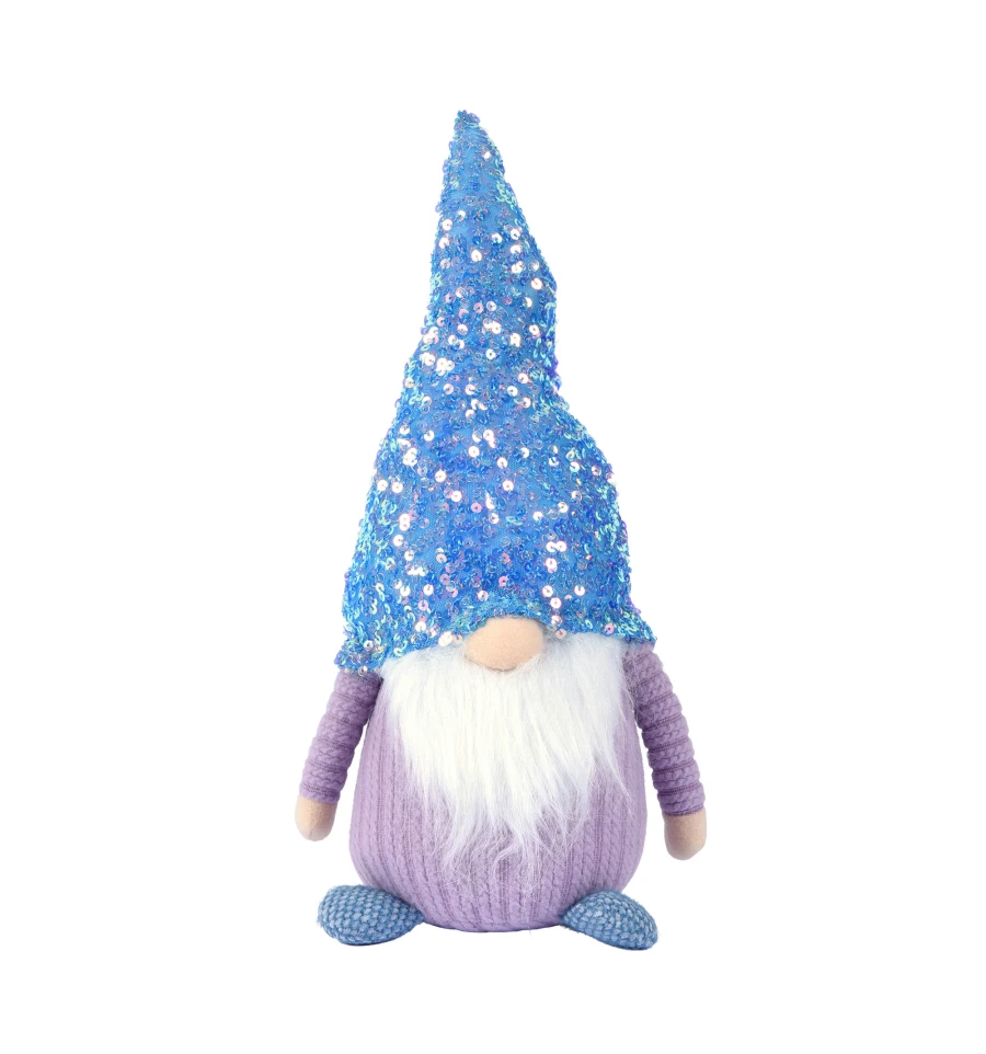 Гном выглядит очень празднично: сиреневый костюм, длинная пушистая белоснежная борода создают образ дружелюбного сказочного героя. Особое внимание привлекает его высокий колпак, полностью украшенный мерцающими голубыми пайетками. Они красиво переливаются в свете гирлянд и свечей, добавляя игрушке праздничного блеска.