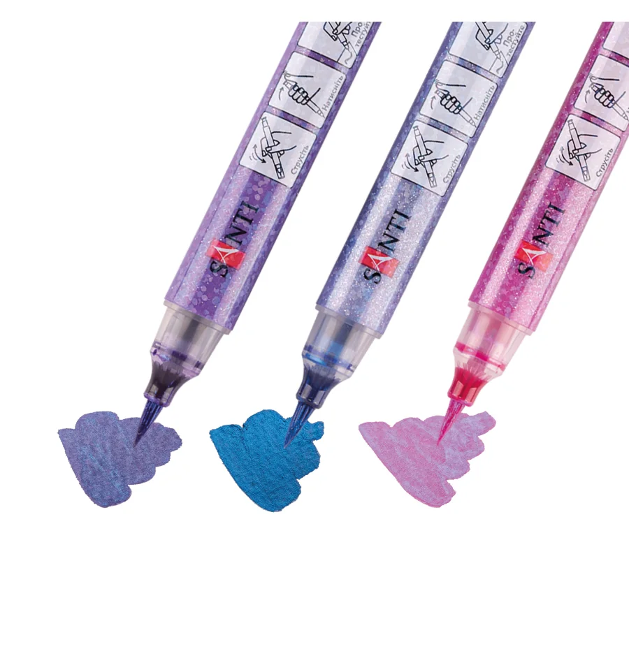 Маркеры акварельные SANTI "Glitter Brush" идеально подходят для выполнения художественных работ в различных техниках, включая скетчин и иллюстрирование. Гибкий наконечник в форме кисточки подходит для рисования штрихов переменной толщины и окрашивания. Чернила на водной основе. Упаковка: 3 шт. Корпус изготовлен из полипропилена.