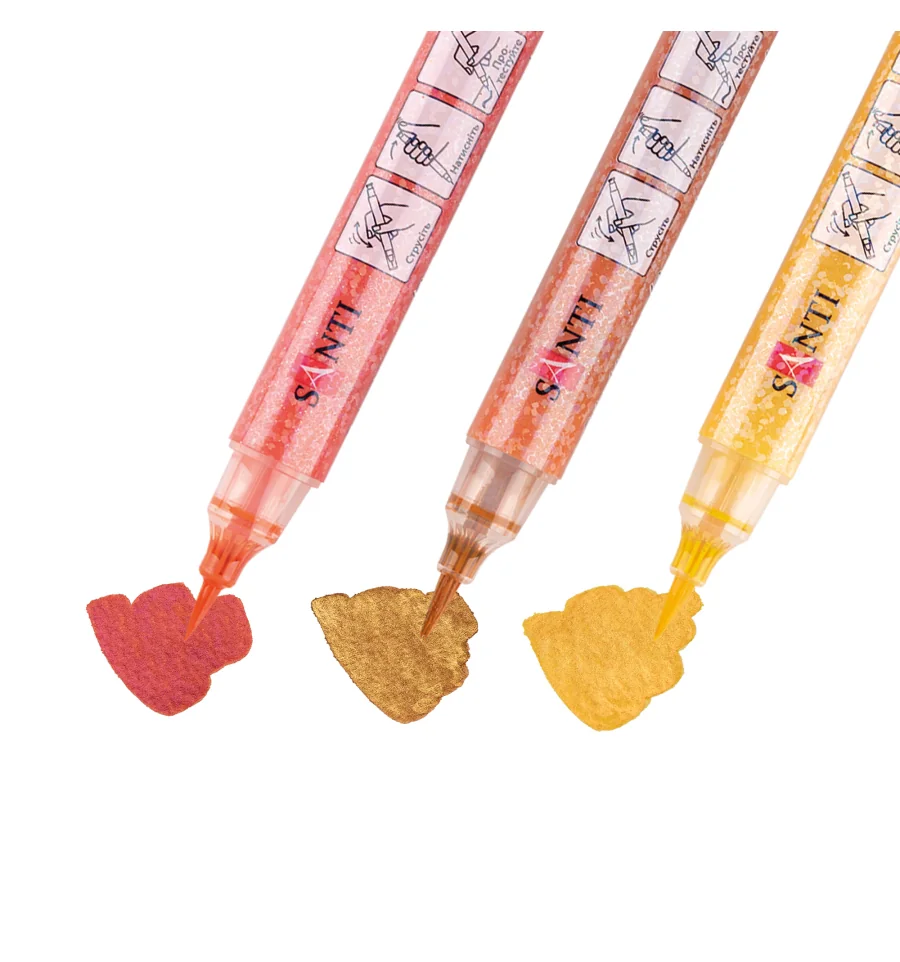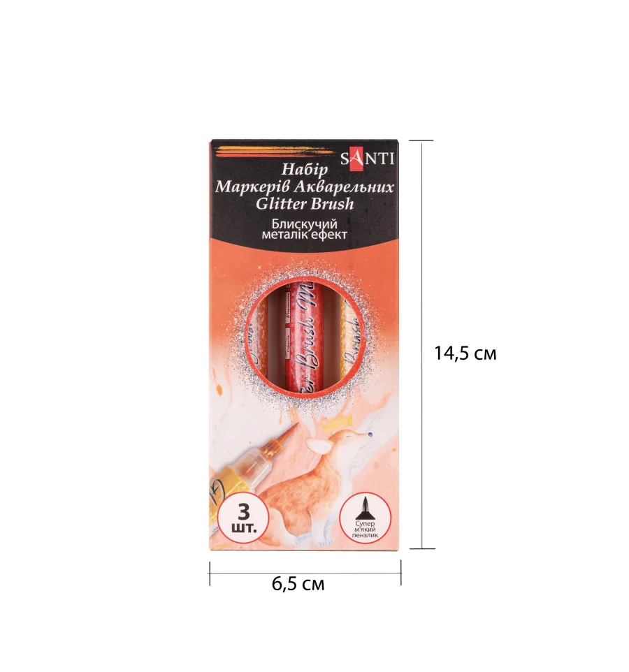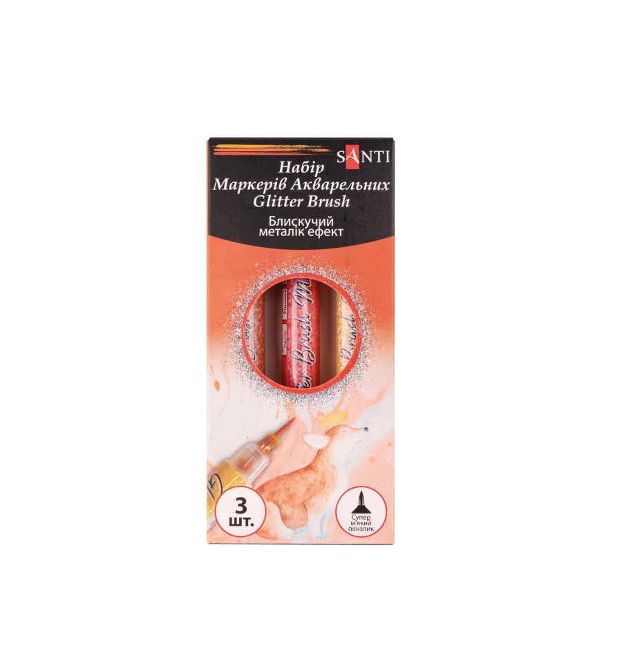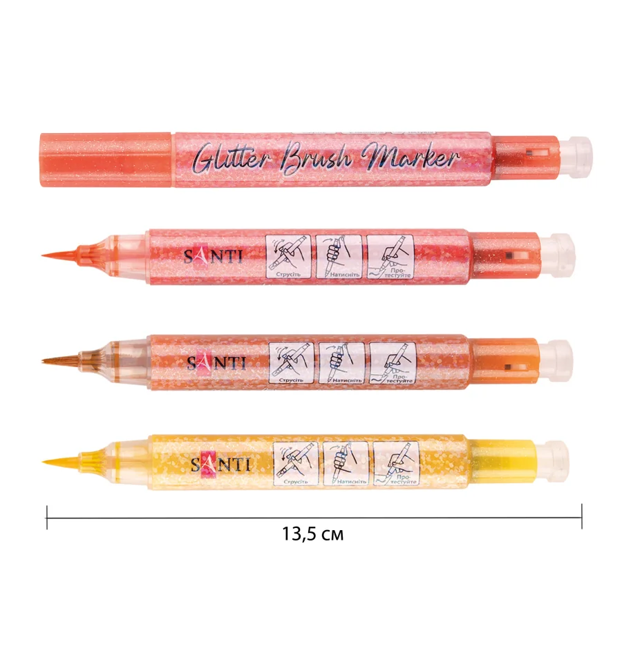 Маркеры акварельные SANTI "Glitter Brush" идеально подходят для выполнения художественных работ в различных техниках, включая скетчин и иллюстрирование. Гибкий наконечник в форме кисточки подходит для рисования штрихов переменной толщины и окрашивания. Чернила на водной основе. Упаковка: 3 шт. Корпус изготовлен из полипропилена.