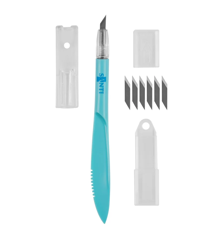 Профессиональный макетный нож для фигурной резки – это нож со сменными лезвиями и цанговым зажимом, универсальный инструмент для разных видов дизайнерских работ. Используется в таких техниках как скрапбукинг, декупаж, киригами. Очень удобен для вырезания сложных элементов и быстрой смены лезвий. Применяется для фигурной резки различных материалов, таких как фетр, бумага, картон, пластик, кожа, декупажная бумага, веллум,