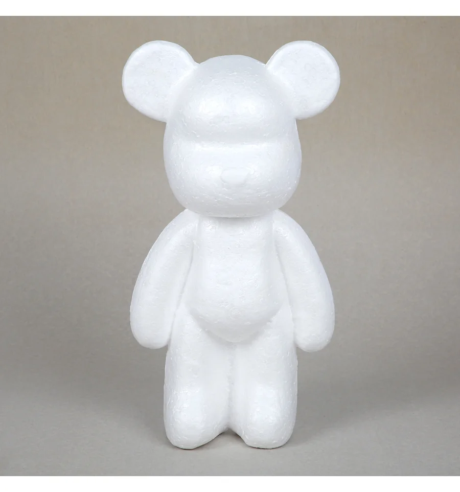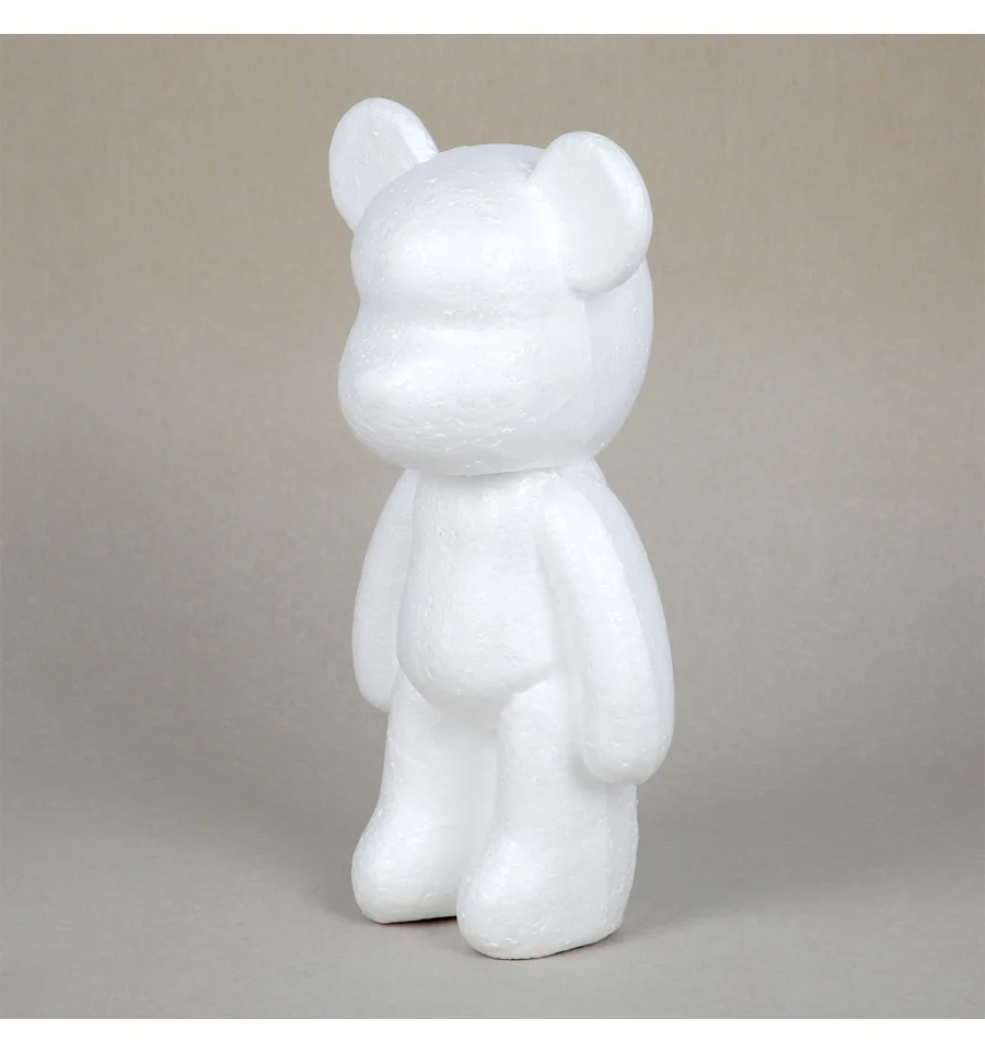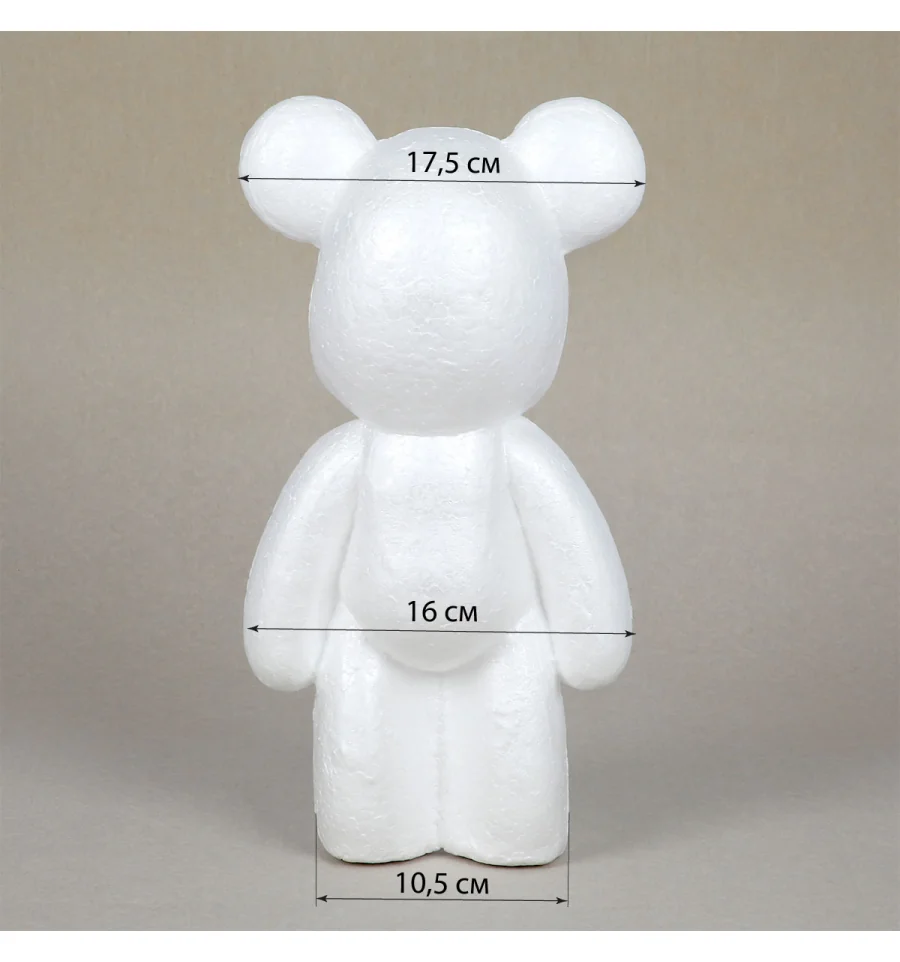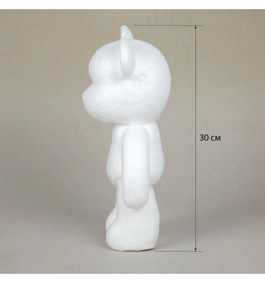 Заготовку из пенопласта в виде медвежонка высотой 30 см можно разрисовывать в любые цвета с помощью акриловых, гуашевых или других художественных красок, оформлять в технике декупаж, покрывать блёстками или украшать в любом другом стиле. Будет увлекательно и для взрослых, и особенно для детей — фигура становится настоящим «холстом» для фантазии, самовыражения, творчества и игры. Идеально подходит для индивидуального оформления, творческих мастер-классов, арт-проектов, фотозон и витрин.
