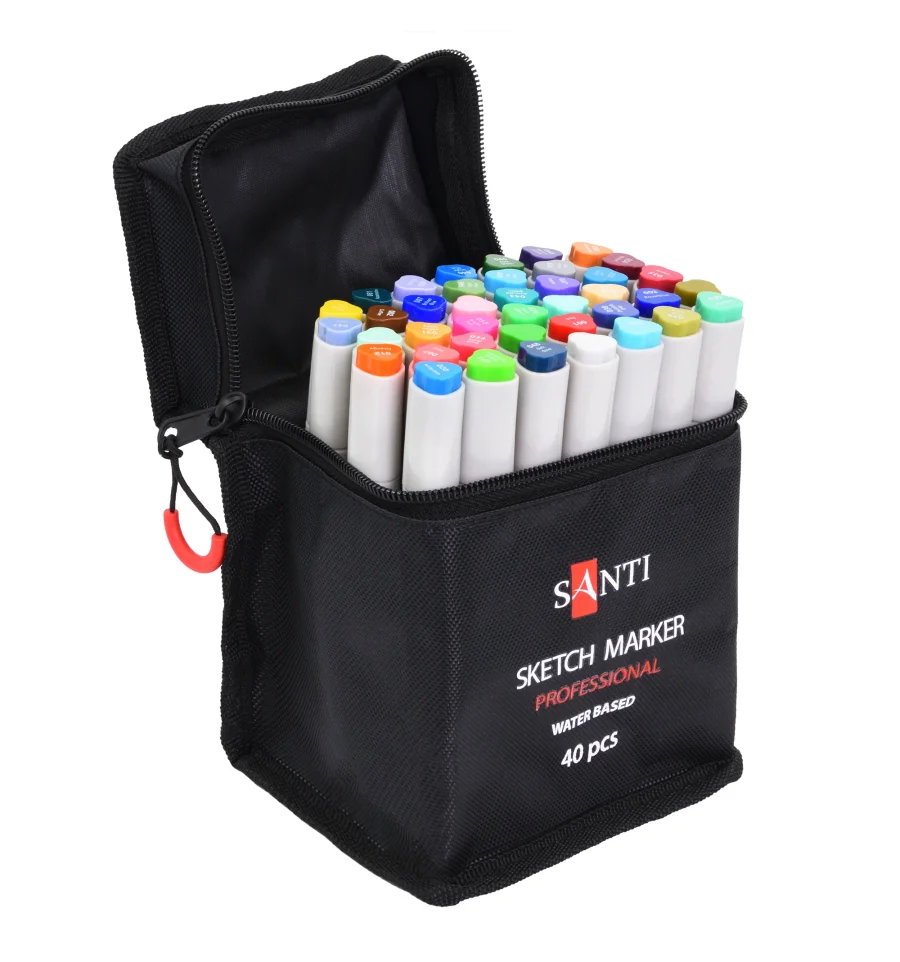 Скетч-маркеры SANTI — это безграничные возможности для ваших рисунков! Широкая цветовая палитра впечатлит даже опытных художников. В наборе 40 шт. Водорастворимые, светостойкие чернила предназначены для живописи и рисования в смешанных техниках. Совмещают в себе свойства маркеров и акварельных красок. Для достижения акварельного эффекта можно размыть детали рисунка при помощи смоченной водой кисти на самой бумаге или разбавить водой чернила на палитре. Оснащены двумя видами наконечников: мягкая кисть для точной детализации рисунка и долото - для заполнения больших фрагментов. Для работы можно использовать акварельную бумагу или специальную бумагу для рисования маркерами.