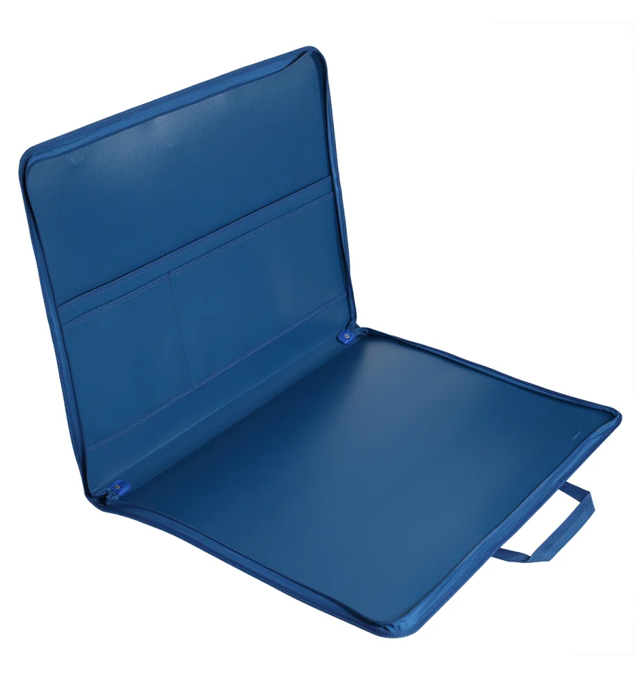Прочная пластиковая основа эффективно защищает содержимое от внешних воздействий, а жёсткая форма папки предотвращает смятие и повреждения листов. Вместительность обеспечивается за счёт боковой стенки шириной 3,9 см — этого достаточно для хранения большого количества работ без необходимости их сворачивать или складывать. Края папки усилены прочным тканевым кантом, который продлевает срок службы изделия и помогает сохранять аккуратный и презентабельный внешний вид.