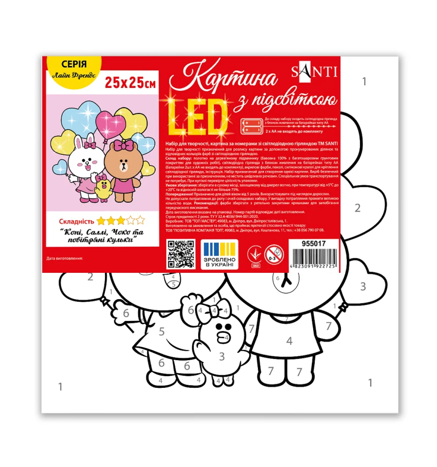 Картина по номерам ТМ SANTI "Лайн Френдс. Кони, Салли, Чоко и воздушные шарики" — это возможность создать живописный шедевр без специальной подготовки. Чёткие пронумерованные контуры на холсте помогут юным художникам легко ориентироваться в процессе рисования. Такой формат так же способствует быстрому освоению и запоминанию цифр в игровой форме — ребёнок будет ассоциировать их с яркими красками и элементами рисунка, что делает обучение простым и весёлым. В наборе используются акриловые краски, они легко ложатся на холст, быстро высыхают, позволяя ребёнку увидеть результат сразу после завершения работы. Набор для творчества изготовлен из натуральных, экологически чистых материалов, что делает процесс рисования комфортным и безопасным даже для самых маленьких художников.