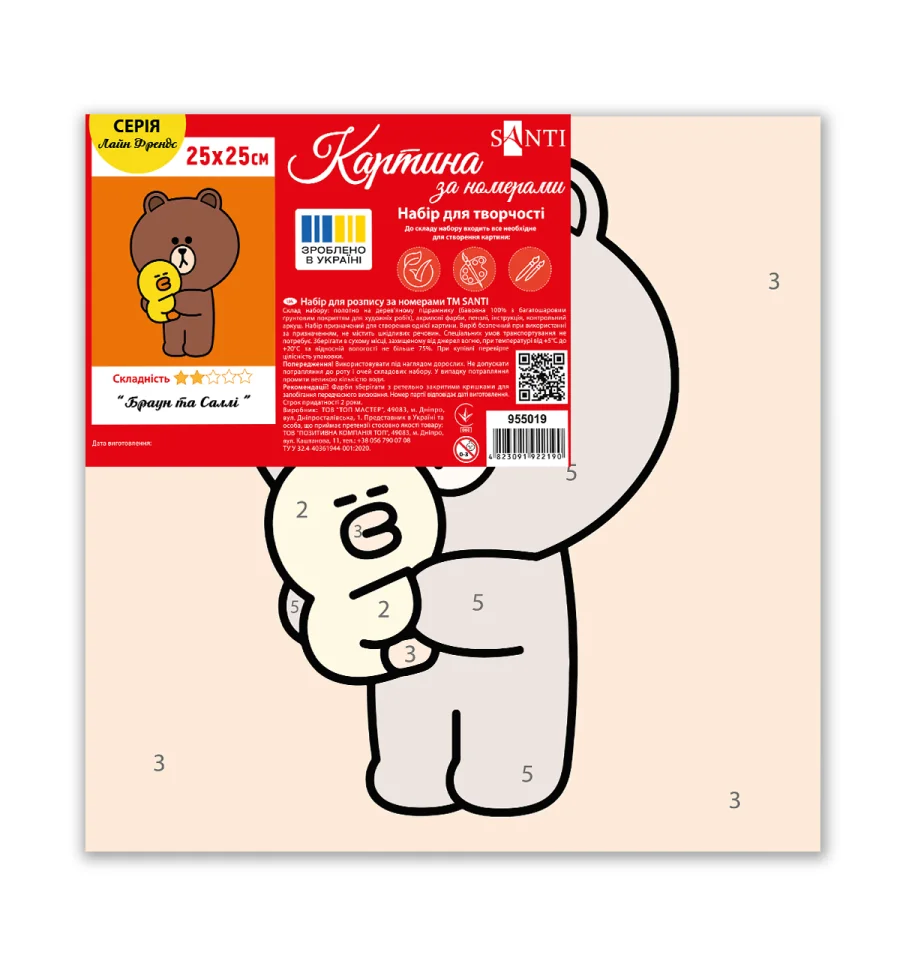 Картина по номерам ТМ SANTI "Лайн Фрэндс. Браун и Салли" — это возможность создать живописный шедевр без специальной подготовки. Чёткие пронумерованные контуры на холсте помогут легко ориентироваться в процессе рисования. Такой формат так же способствует быстрому освоению и запоминанию цифр в игровой форме — ребёнок будет ассоциировать их с яркими красками и элементами рисунка, что делает обучение простым и весёлым. Для удобства малышей пронумерованные сегменты холста предварительно окрашены в соответствующие цвета, что облегчает процесс раскрашивания и помогает быстрее ориентироваться в рисунке. В наборе используются акриловые краски, они легко ложатся на холст, быстро высыхают, позволяя ребёнку увидеть результат сразу после завершения работы. Набор для творчества изготовлен из натуральных, экологически чистых материалов, что делает процесс рисования комфортным и безопасным даже для самых маленьких художников.
