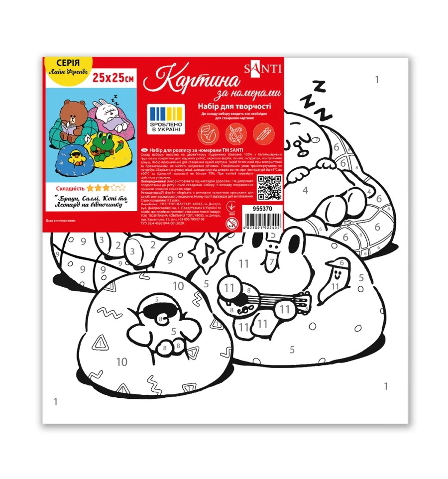Картина по номерам ТМ SANTI "Лайн Френдс. Браун, Салли, Кони и Леонард на отдыхе" — это возможность подарить ребёнку радость творчества, уверенность в своих силах и новые знания!