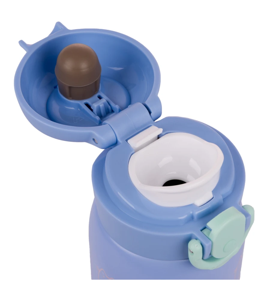 Откидная крышка удобно открывается одной рукой с помощью кнопки, а дополнительный фиксатор предотвращает протекание. Обладает силиконовыми элементами, обеспечивающими герметичность.