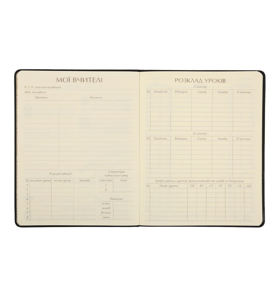 - Информационный блок - данные ученика, учителей и школы, расписание уроков и звонков, табель успеваемости