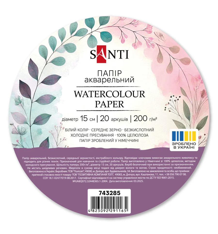 Набор ТМ SANTI содержит 20 листов акварельной бумаги диаметром 15 см, плотностью 200 г/м2, изготовленной в Германии из 100% целлюлозы, методом холодного прессования. Выдерживает многослойное нанесение краски, не деформируется и не просвечивает, хорошо держит цвет. Текстурированная, среднезернистая поверхность бумаги, позволяет создавать интересные эффекты и переходы, а её белый цвет обеспечивает точную передачу оттенков и насыщенность красок. Одним из преимуществ бумаги, является её бескислотный состав, который предотвращает выцветание рисунка, благодаря этому ваши работы сохранят яркость и насыщенность цветов долгие годы. Оптимальна для различных акварельных техник, включая работу кистью, губкой и карандашом, тушью.