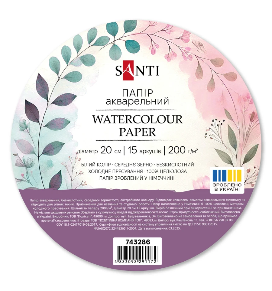 Набор ТМ SANTI содержит 15 листов акварельной бумаги диаметром 20 см, плотностью 200 г/м2, изготовленной в Германии из 100% целлюлозы, методом холодного прессования. Выдерживает многослойное нанесение краски, не деформируется и не просвечивает, хорошо держит цвет. Текстурированная, среднезернистая поверхность бумаги, позволяет создавать интересные эффекты и переходы, а её белый цвет обеспечивает точную передачу оттенков и насыщенность красок. Одним из преимуществ бумаги, является её бескислотный состав, который предотвращает выцветание рисунка, благодаря этому ваши работы сохранят яркость и насыщенность цветов долгие годы. Оптимальна для различных акварельных техник, включая работу кистью, губкой и карандашом, тушью.