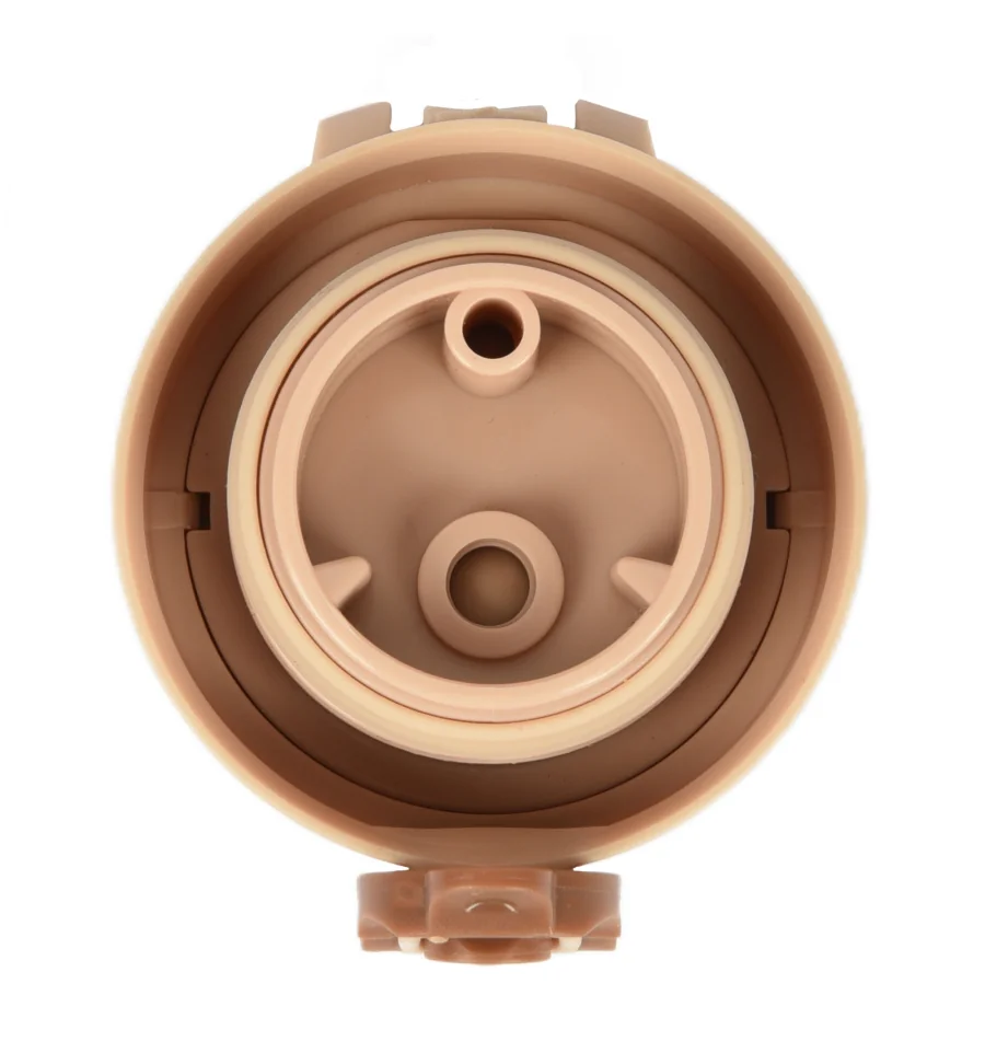 Откидная крышка удобно открывается одной рукой с помощью кнопки, а дополнительный фиксатор предотвращает протекание. Обладает силиконовыми элементами, обеспечивающими герметичность.