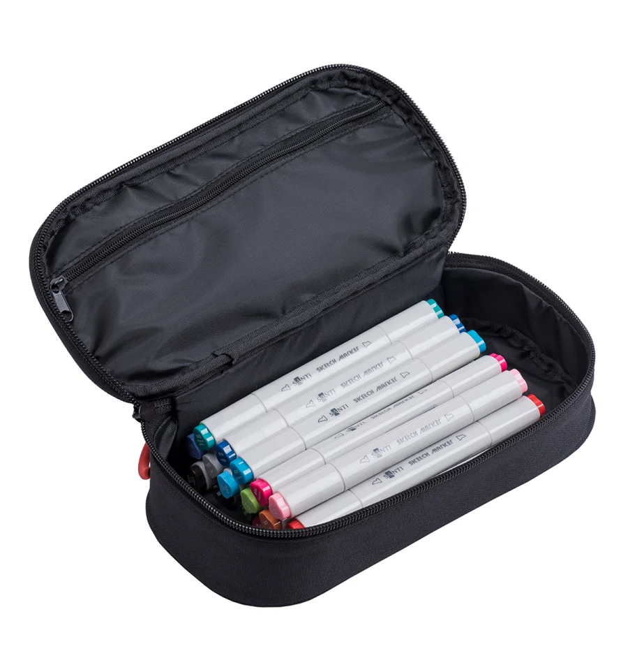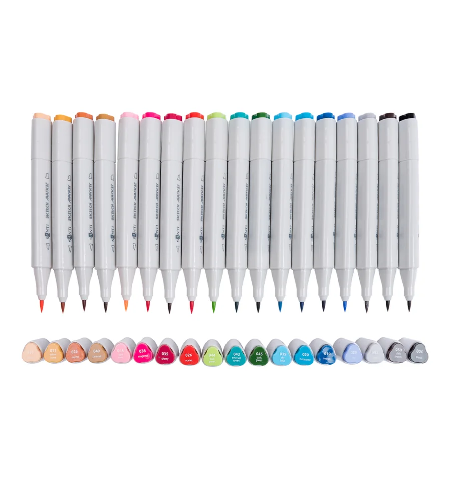 Скетч-маркеры SANTI — это безграничные возможности для ваших рисунков! Прекрасный набор из 18 маркеров, упакованных в фирменный пенал. Набор состоит из следующих оттенков: чёрный 04, телесный 16, ярко-синий 40, бирюзовый 20, сиена 25, алый 26, светло-розовый 28, сиреневый 29, охра желтая 31, серый 32, вишневый 35, маджента 36, небесно-голубой 39, изумрудно-зеленый 43, желто-зеленый 44, темно-зеленый 45, карамель 49, темно-коричневый 50. Набор пригодится для рисования на пленэре или в путешествии. Водорастворимые, светостойкие чернила предназначены для живописи и рисования в смешанных техниках.