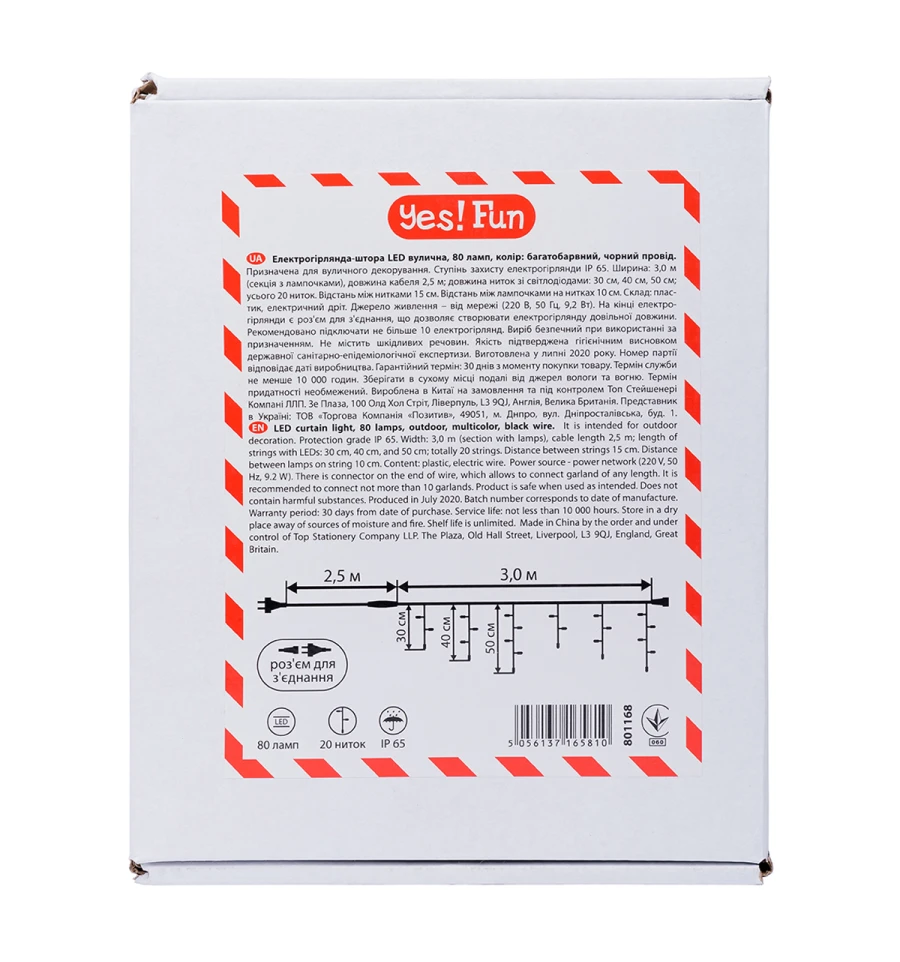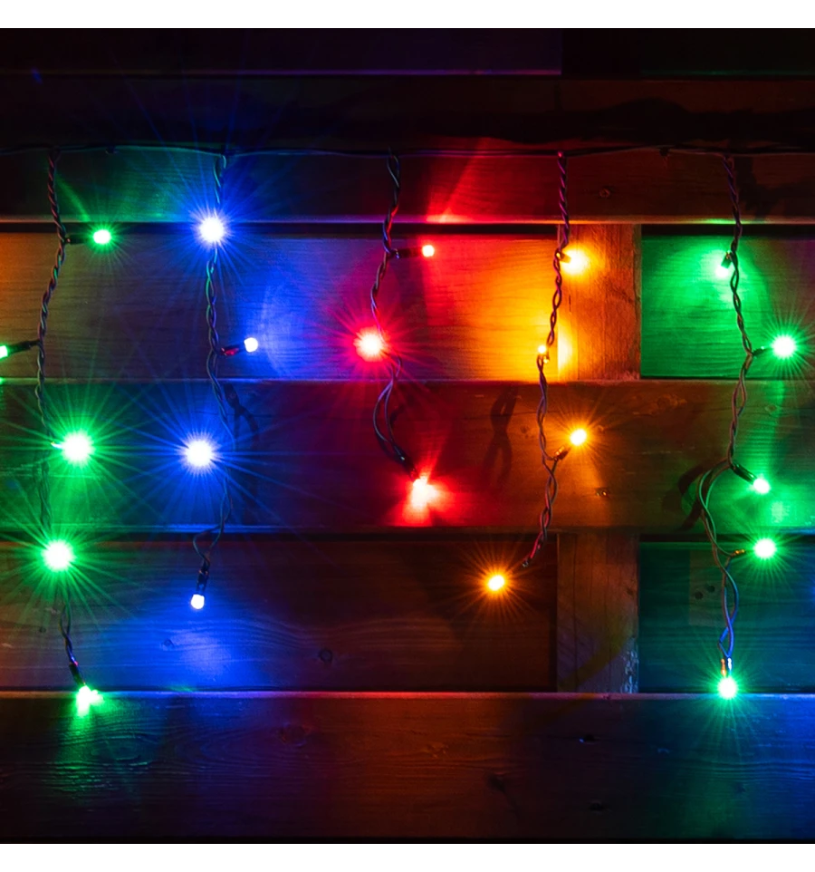 Электрогирлянда-штора используется для уличного декорирования. Цвет светящихся лампочек - многоцветный, цвет провода — черный. Количество лампочек: 80 шт.. Расстояние между лампочками: 10 см.. Длина нитей со светодиодами: 30 см, 40 см, 50 см. Всего нитей: 20 шт. Степень защиты электрогирлянды IP 65 позволяет размещать электрогирлянду на улице круглый год, независимо от погодных условий. Длина провода: 5,5 м (3 м — секция с лампочками, 2,5 м — длина кабеля). Состав: пластик, электрический провод. Источник питания: от сети (220 В, 50 Гц, 9,2 Вт). В конце электрогирлянды есть разъем для соединения, который позволяет создавать электрогирлянду произвольной длины. Рекомендуется соединять не более 10 электрогирлянд.