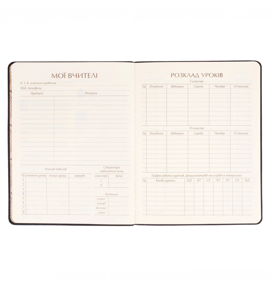 - Информационный блок - данные ученика, учителей и школы, расписание уроков и звонков, табель успеваемости