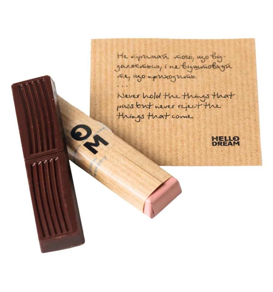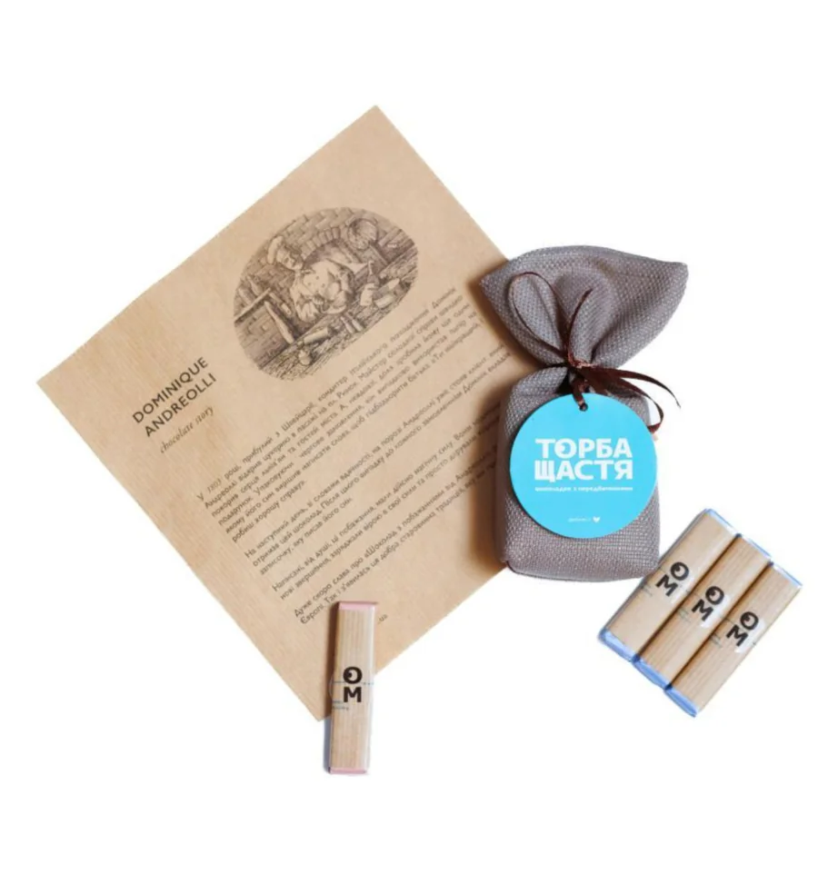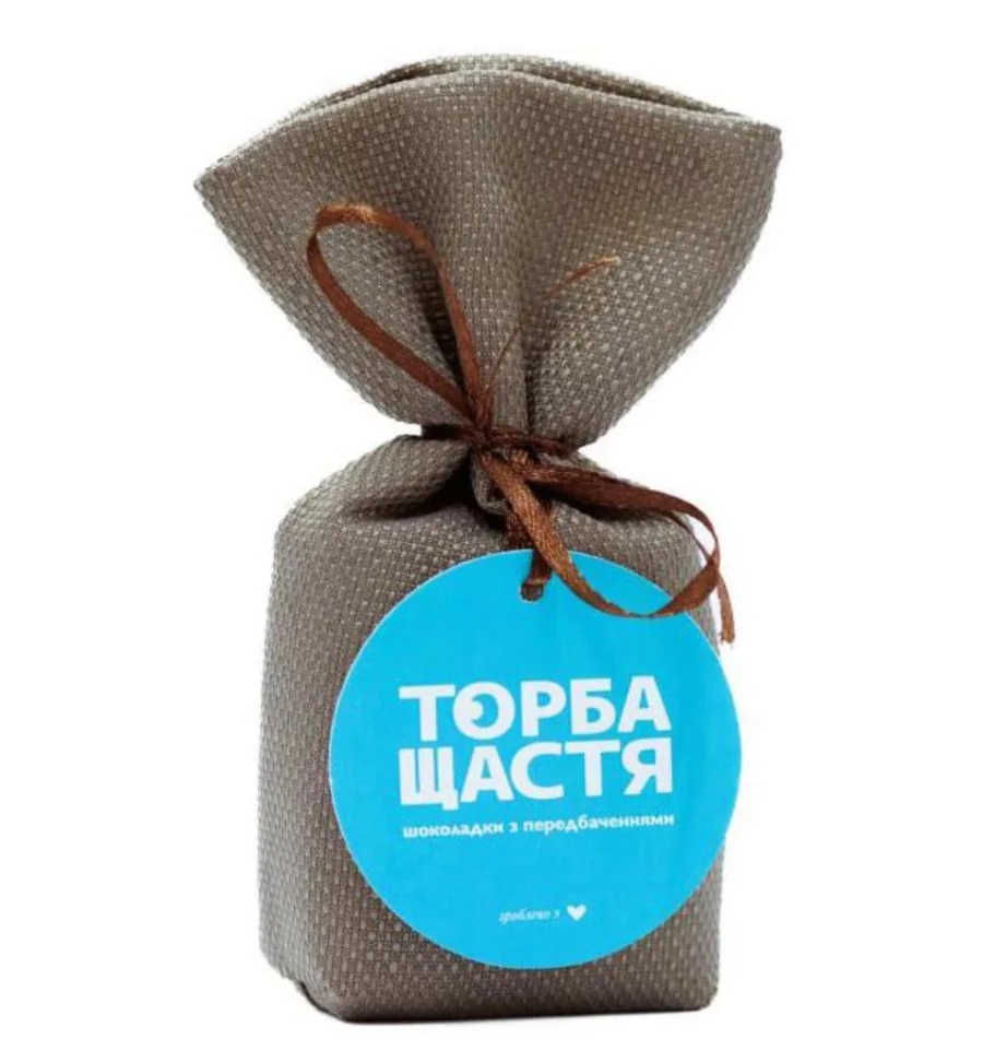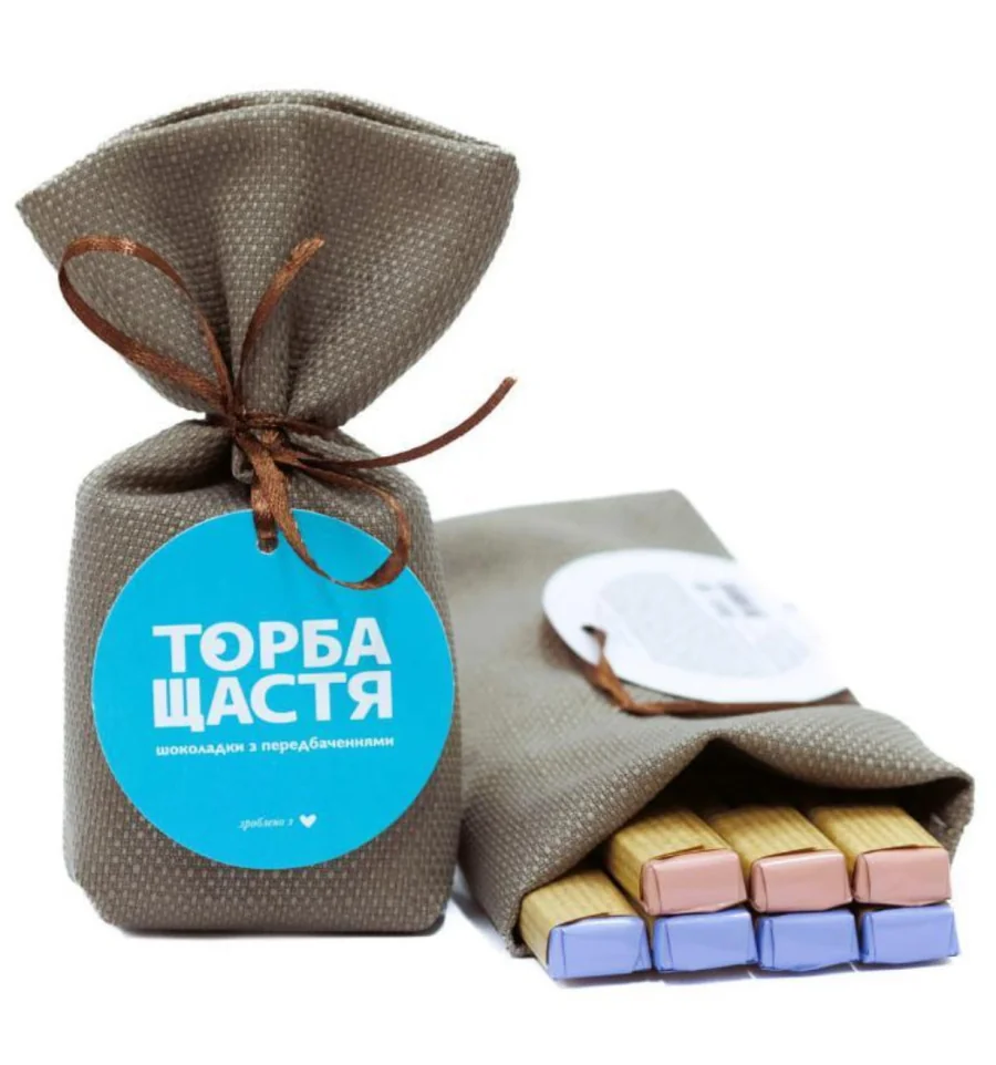 Это волшебный мешочек. Внутри него семь с любовью упакованных чудо-шоколадок с предсказаниями. Каждая шоколадка весом 12,5 г. Очень вкусный молочный шоколад с нежными начинками: трюфельными и ореховыми кранчами и ягодной. Люди говорят, что очень вкусно. Каждая шоколадка с уникальным креативным и добрым пожеланием, которое дублируется на двух языках на украинском и английском.