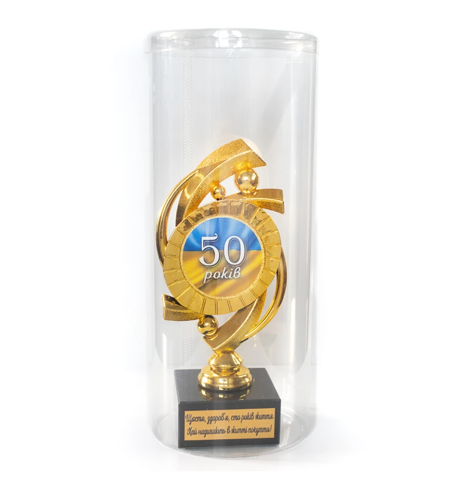 Ищете идеальный подарок на юбилей? Хотите удивить и порадовать именинника в этот особенный день? Не знаете, что подарить отцу, начальнику или другу? У нас есть решение - статуэтка Юбилейная! Статуэтка на юбилей- это не просто сувенир, это символ вашей любви и уважения. Это оригинальный и запоминающийся подарок, который вызовет улыбку и радость у юбиляра. Статуэтка представляет собой две переплетающиеся изогнутые ленты внутри расположен круглый медальон на котором располагается жетон с надписью. Статуэтка выполнена из пластика с покрытием под золото на устойчивой подставке из натурального камня и изящной надписью на золотом фоне с поздравлением на украинском языке. На жетоне статуэтки на сине-желтом фоне указывается знаменательная дата. Статуэтка упаковывается в индивидуальный подарочный тубус из прозрачного пластика. Уникальная упаковка разработана компанией PrazdnikShop. Не упустите свой шанс сделать юбиляру незабываемый подарок! Закажите статуэтку прямо сейчас на нашем сайте или позвоните нашему менеджеру по телефону. Статуэтка от PrazdnikShop - это подарок, который оценят все!