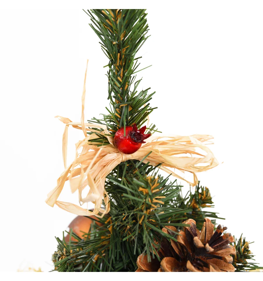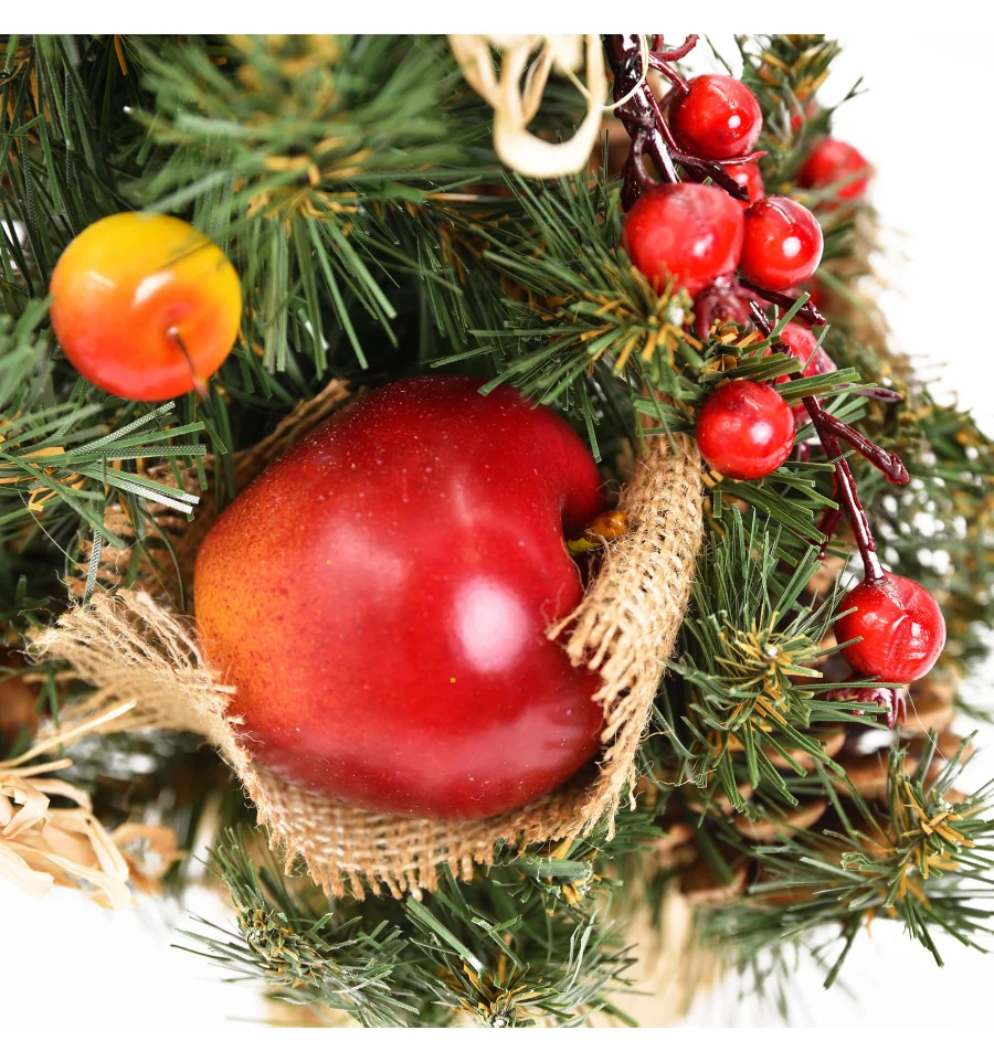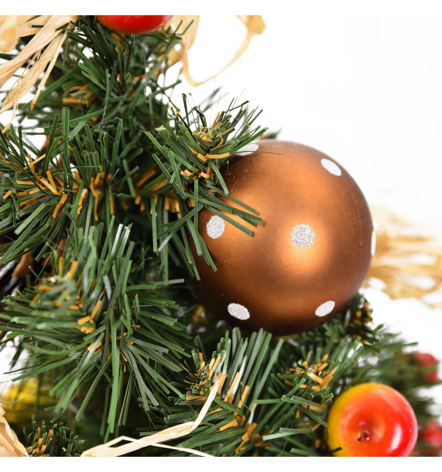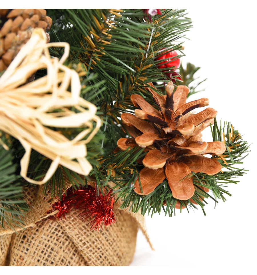 Искусственная маленькая ель с яркими ягодными аксессуарами – отличный декор для помещения в период новогодних праздников, который можно использовать, украшая множество поверхностей в доме, офисе, в торговых центрах. Поставьте такую ель на столе, полке, тумбочке, на прилавке магазина, в прикассовой зоне – и праздничное настроение окружающим будет гарантировано. Компактность и качественное исполнение данного украшения – это и есть его главные преимущества. Материал: ПВХ пленка шириной 6 см; проволока; деревянный пенек, обтянутый мешковиной. Высота: 45 см. Диаметр нижнего ряда: 32 см. Габариты: 0,45м.