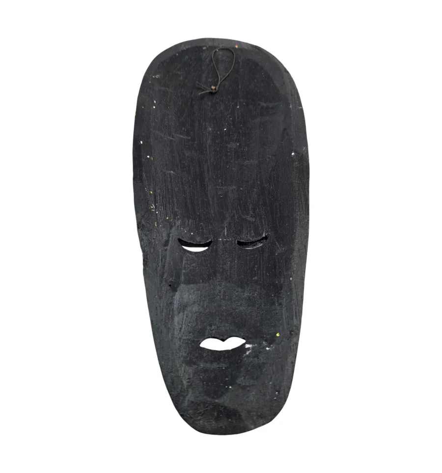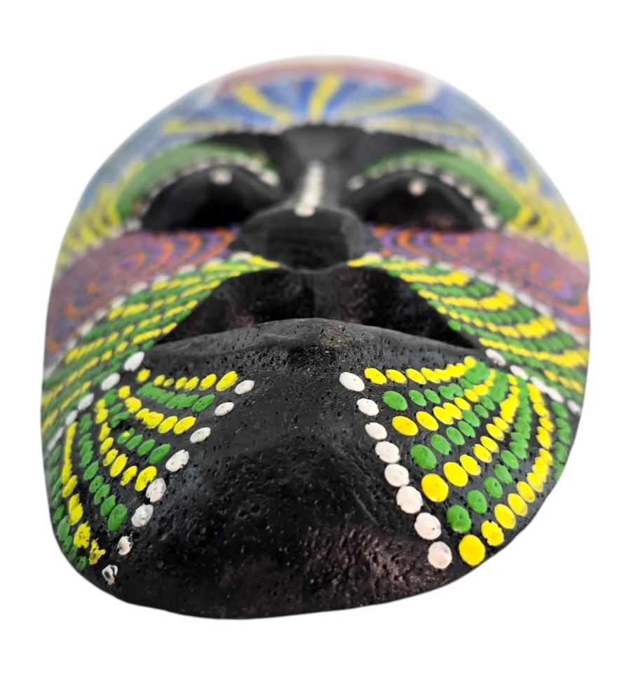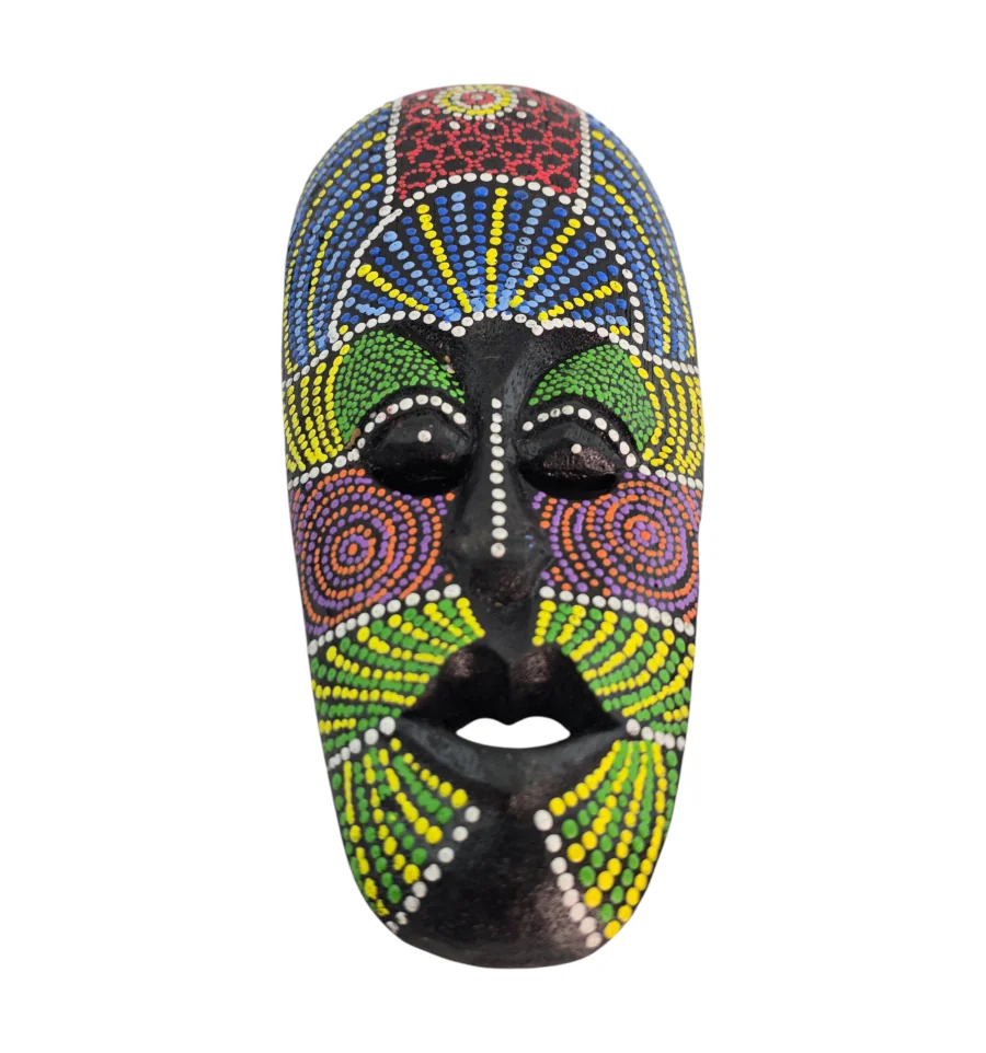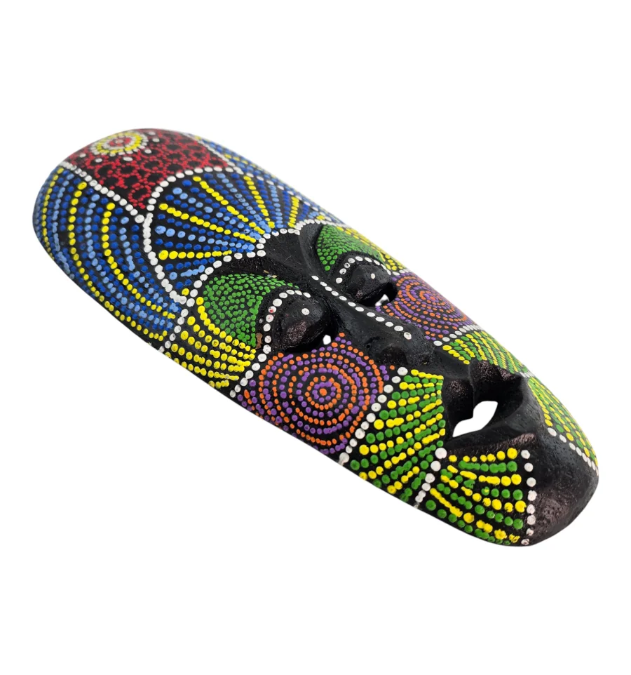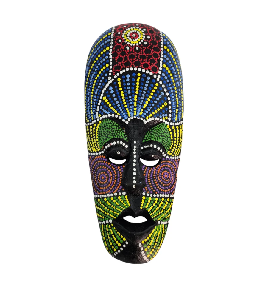 Изготовлена из натурального дерева мастерами в Индонезии. Каждая маска украшена вручную в технике точечной росписи (dot art) в традиционном африканском стиле. Яркие насыщенные цвета — красный, синий, желтый, зеленый, фиолетовый и белый — образуют уникальные узоры на глубоком чёрном фоне.
