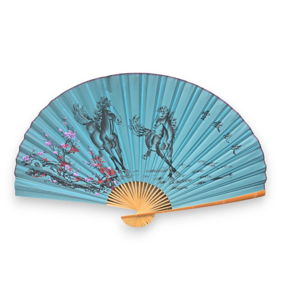 На веере изображены Лошади, символизирующие долголетие и счастье, на красивом бирюзовом фоне.. Этот мотив придаст вашему интерьеру восточный колорит и загадочность.