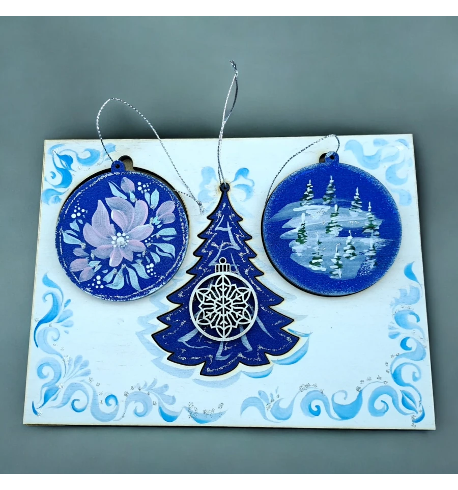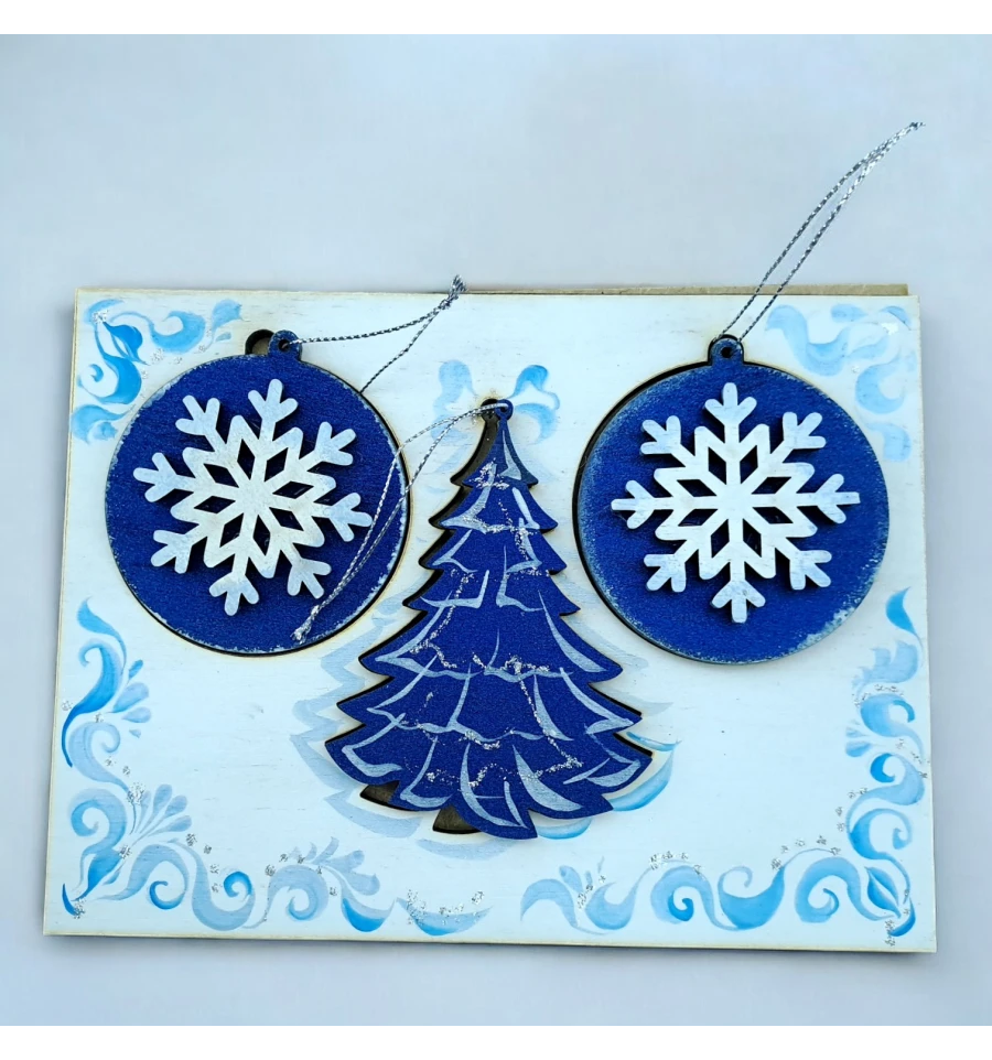 Крафтовая новогодняя открытка "Морозные узоры" (200*150*8мм).Комплект 3 подвески с аппликацией подвески на планшете все элементы из дерева, расписано вручную.