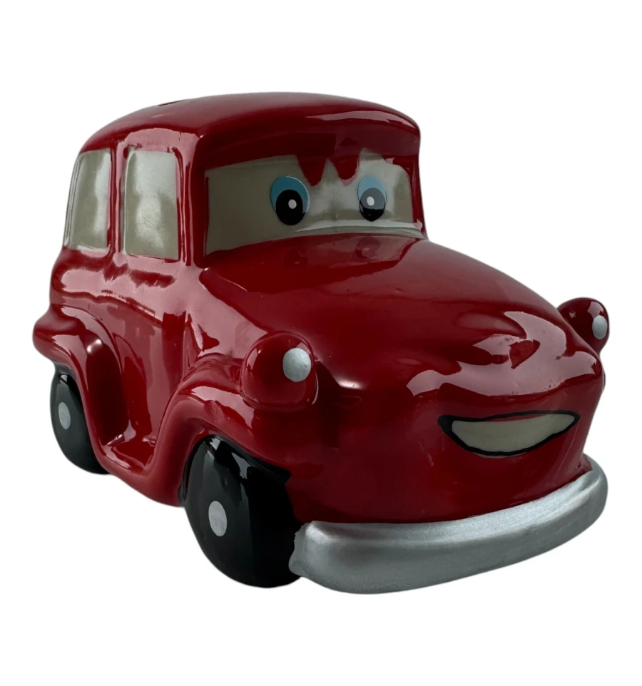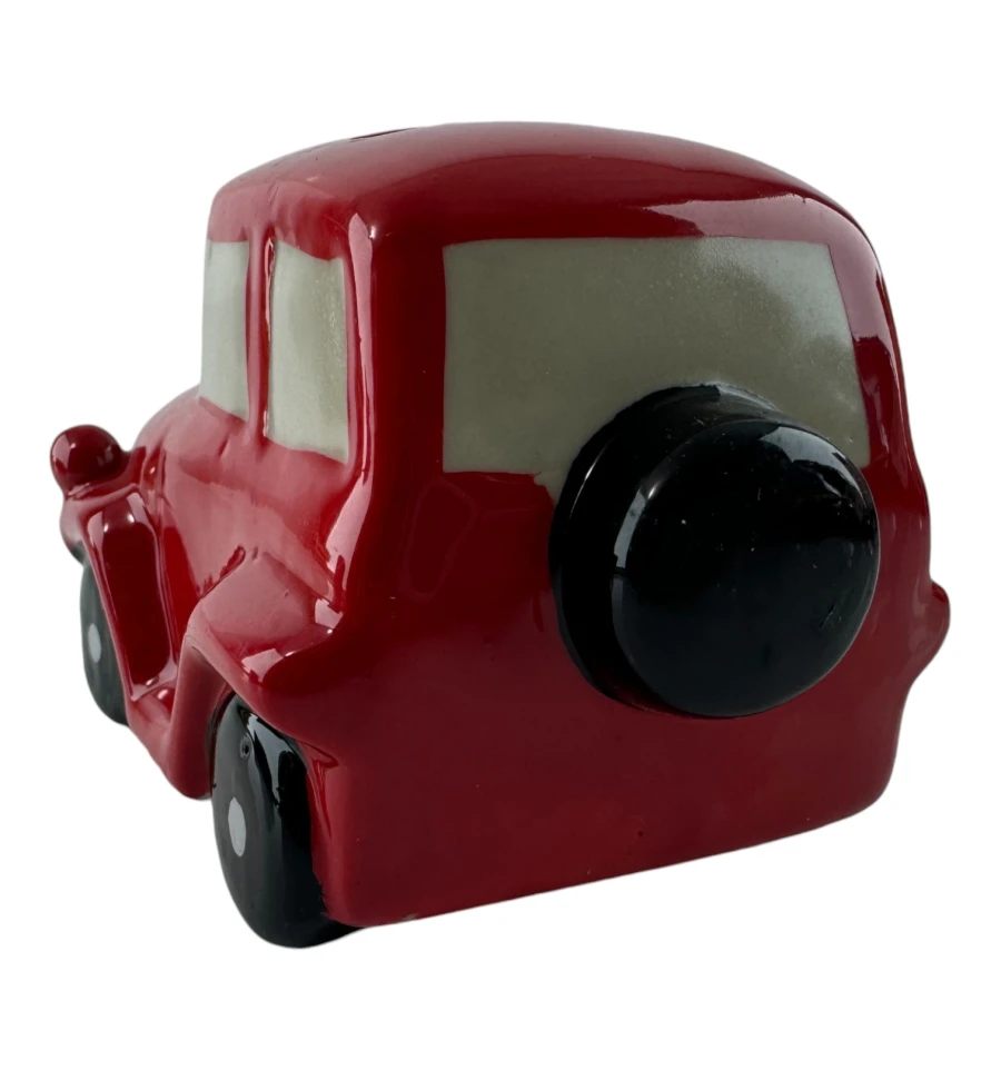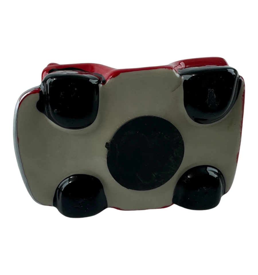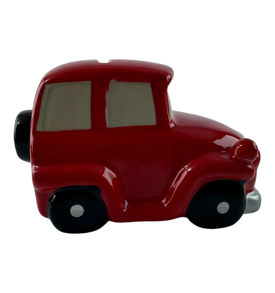 Эта очаровательная керамическая копилка выполнена в виде красного ретро-автомобиля с забавными глазами и широкой улыбкой. Прекрасный декоративный элемент и функциональный аксессуар для хранения мелочи. Изделие имеет съёмную резиновую вставку на дне, благодаря чему монетки можно легко достать, не разбивая копилку.