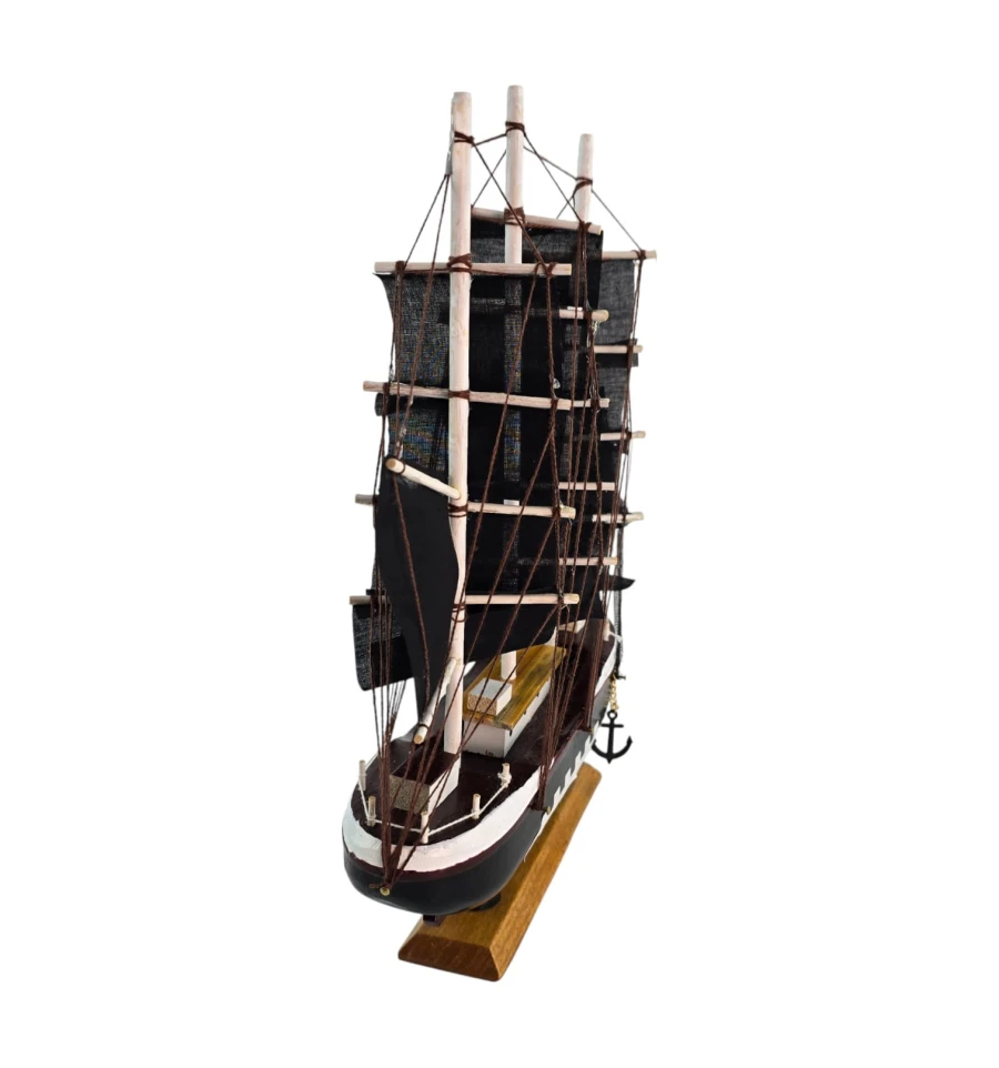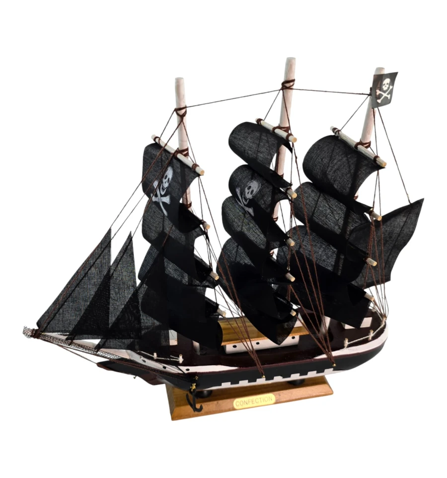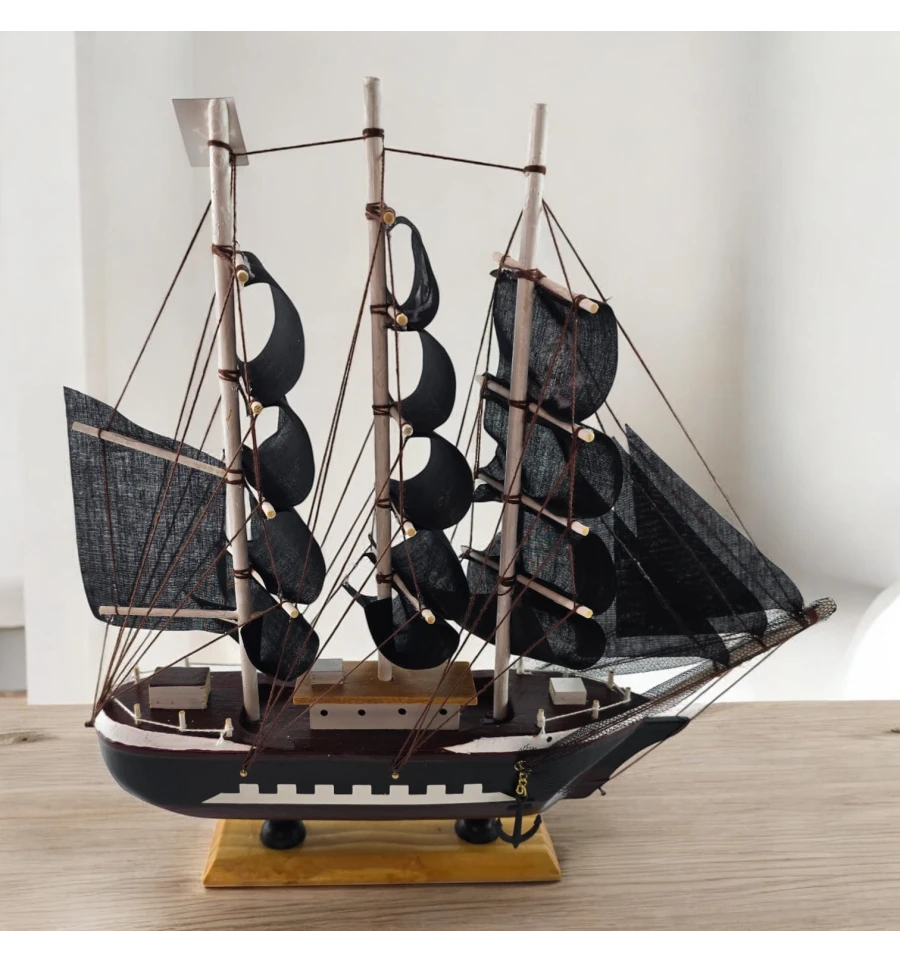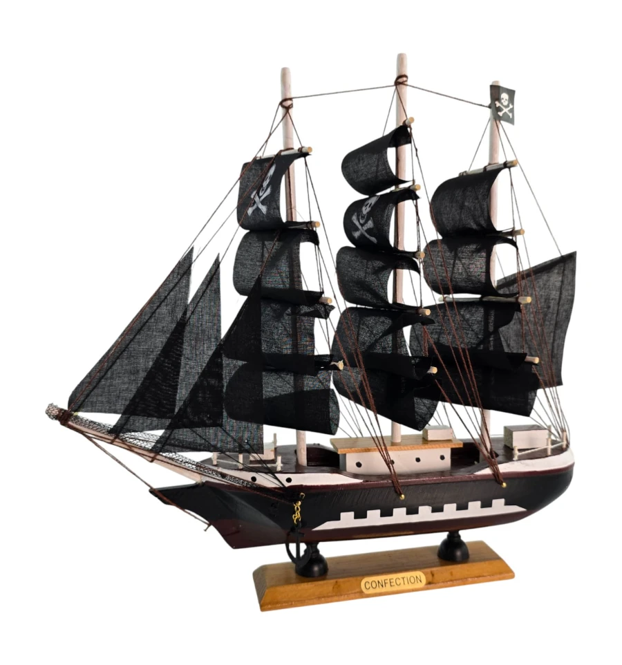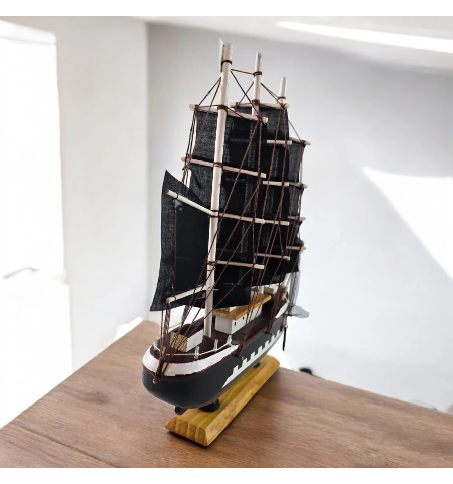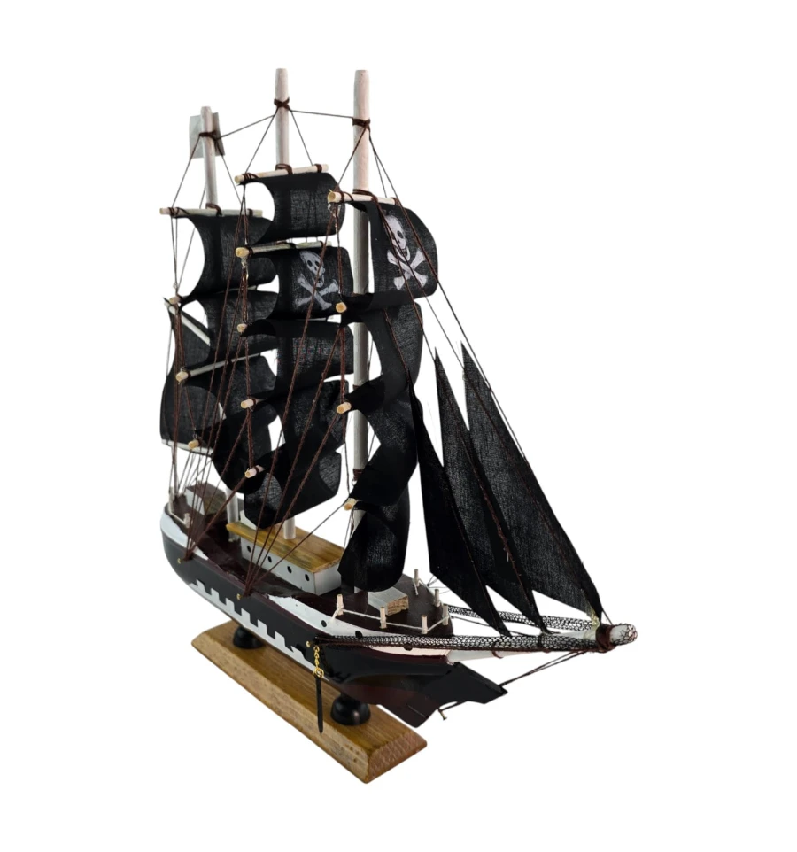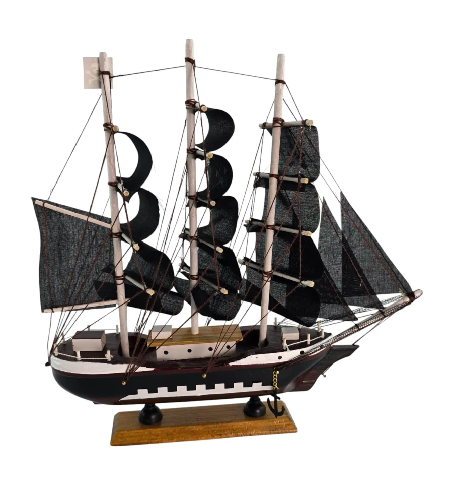 Настольная модель парусника с чёрными «пиратскими» парусами - эффектный акцент для кабинета, гостиной или детской. Корабль выполнен из дерева с тканевыми парусами и установлен на подставке, поэтому его удобно размещать на полке или рабочем столе. Отличный подарок любителям морской тематики, путешествий и истории флота.