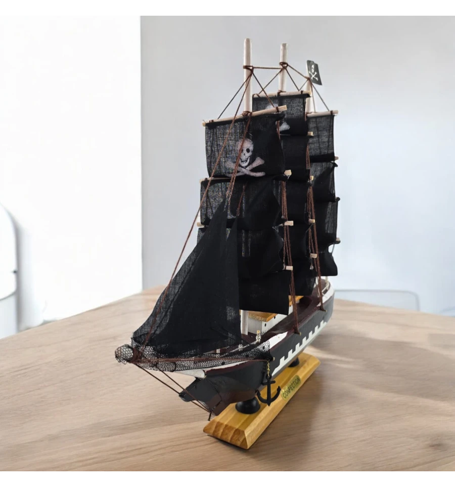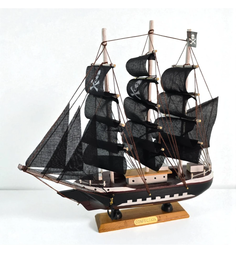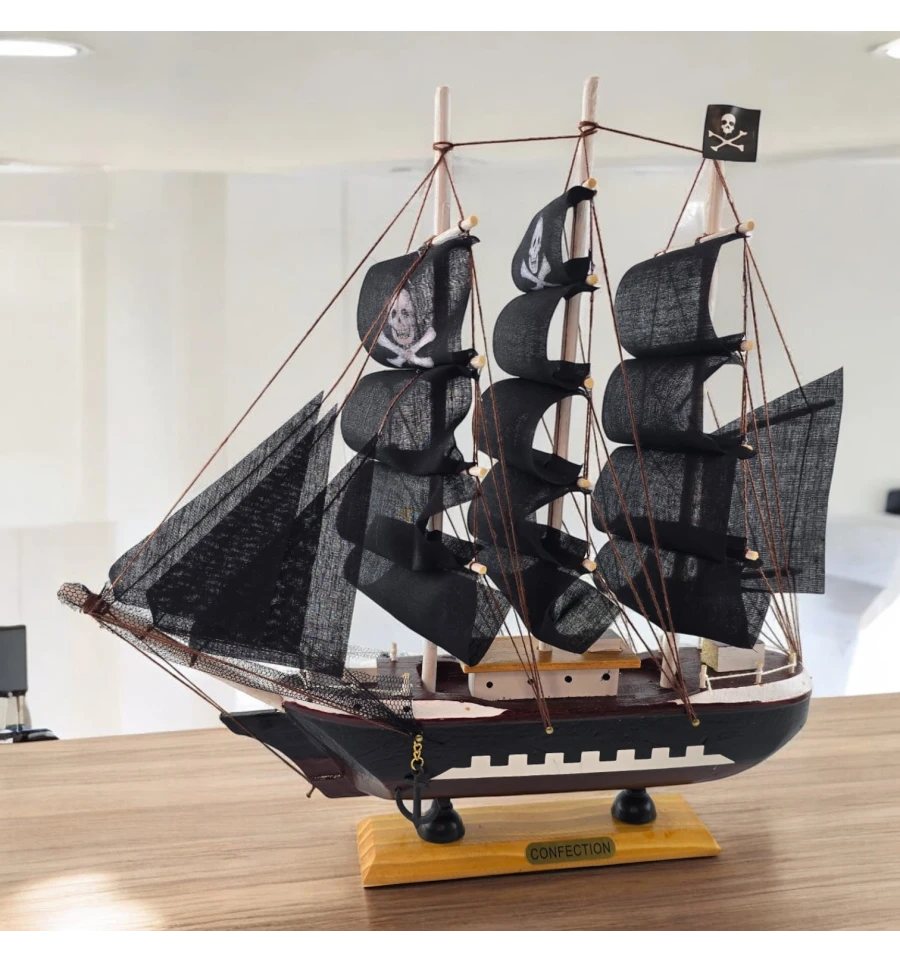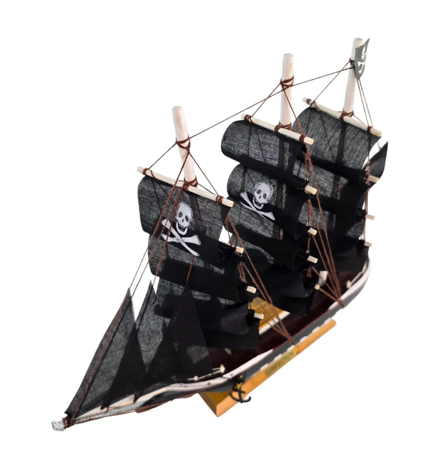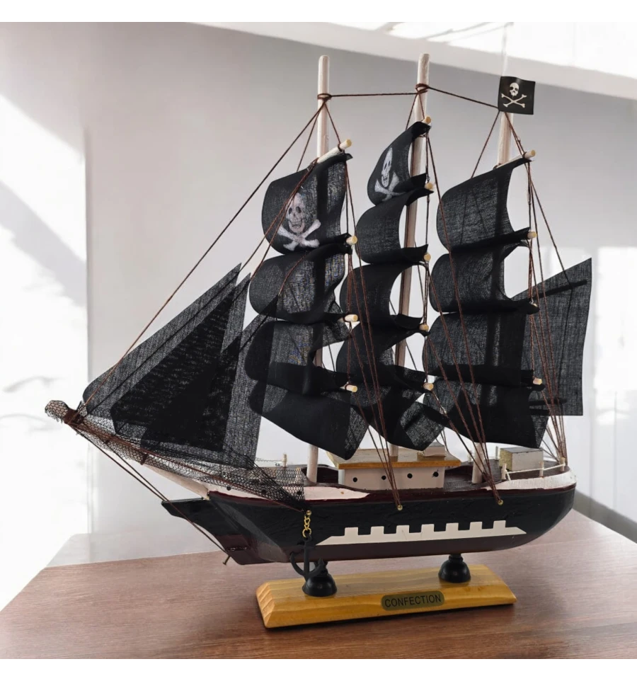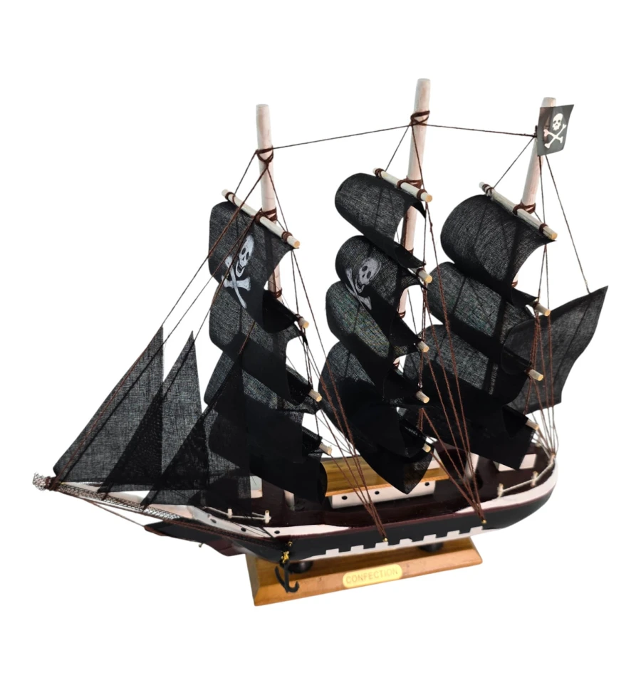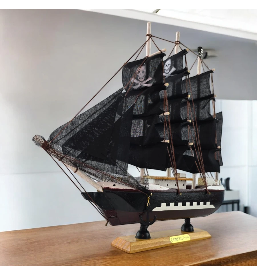 Настольная модель парусника с чёрными «пиратскими» парусами - эффектный акцент для кабинета, гостиной или детской. Корабль выполнен из дерева с тканевыми парусами и установлен на подставке, поэтому его удобно размещать на полке или рабочем столе. Отличный подарок любителям морской тематики, путешествий и истории флота.