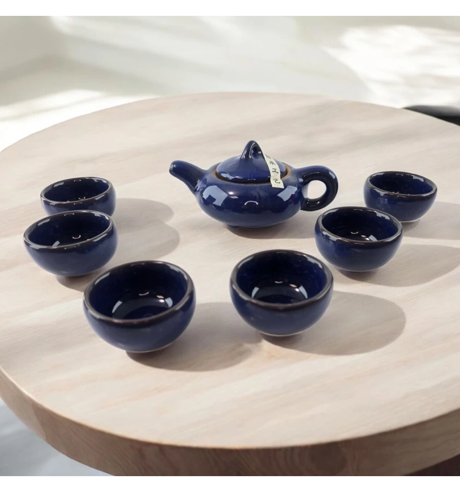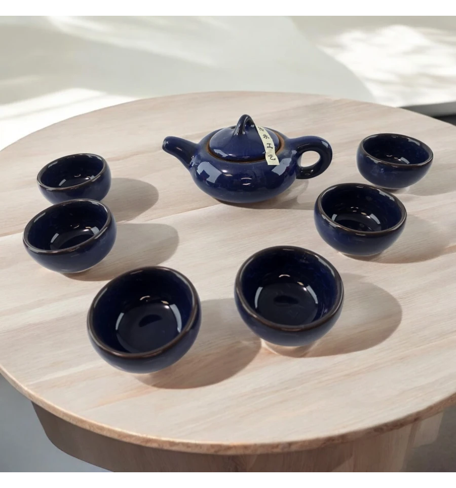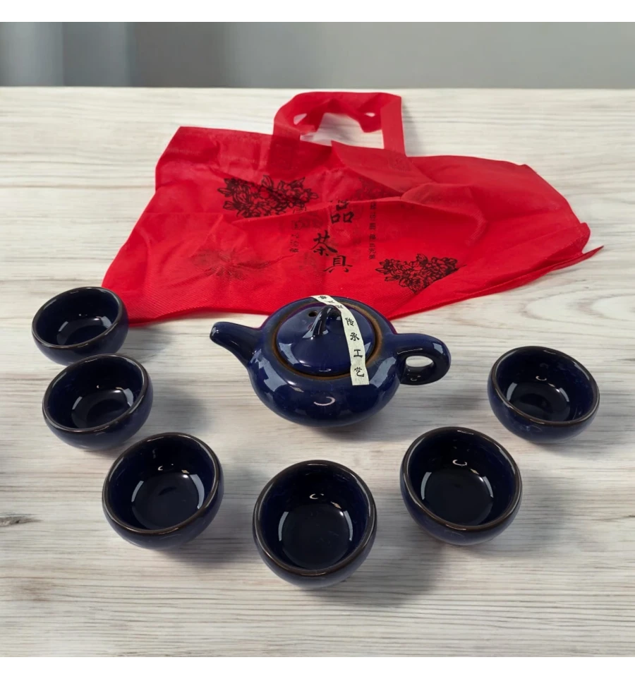 Особенности: Стильный керамический набор для чайной церемонии в темно-синем цвете, включающий чайник и шесть чашек, с удобной тканевой сумкой для хранения. Прекрасный выбор для создания особого чайного ритуала.