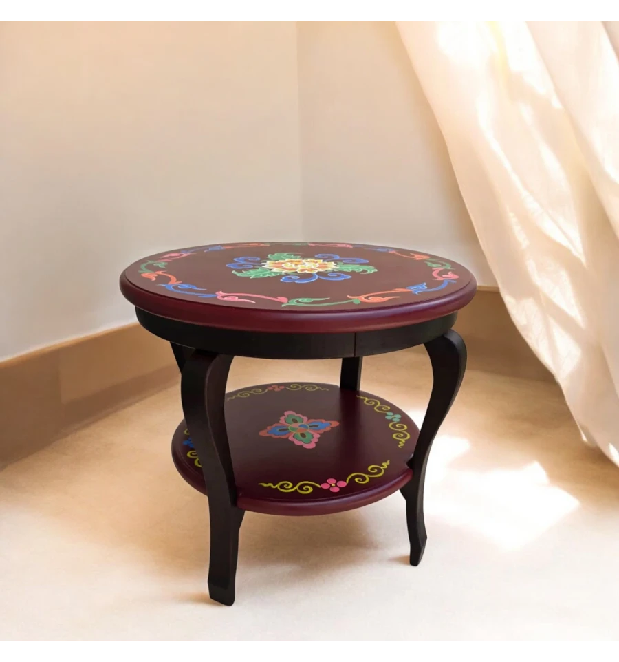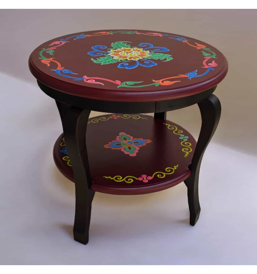 Этот прекрасный стол диаметром 53 см и высотой 48 см изготовлен из дерева и украшен ручной росписью, отображающей традиционный тибетский орнамент. Стол является не только функциональным предметом мебели, но и настоящим произведением искусства, которое внесет в интерьер особый колорит и уникальную атмосферу.