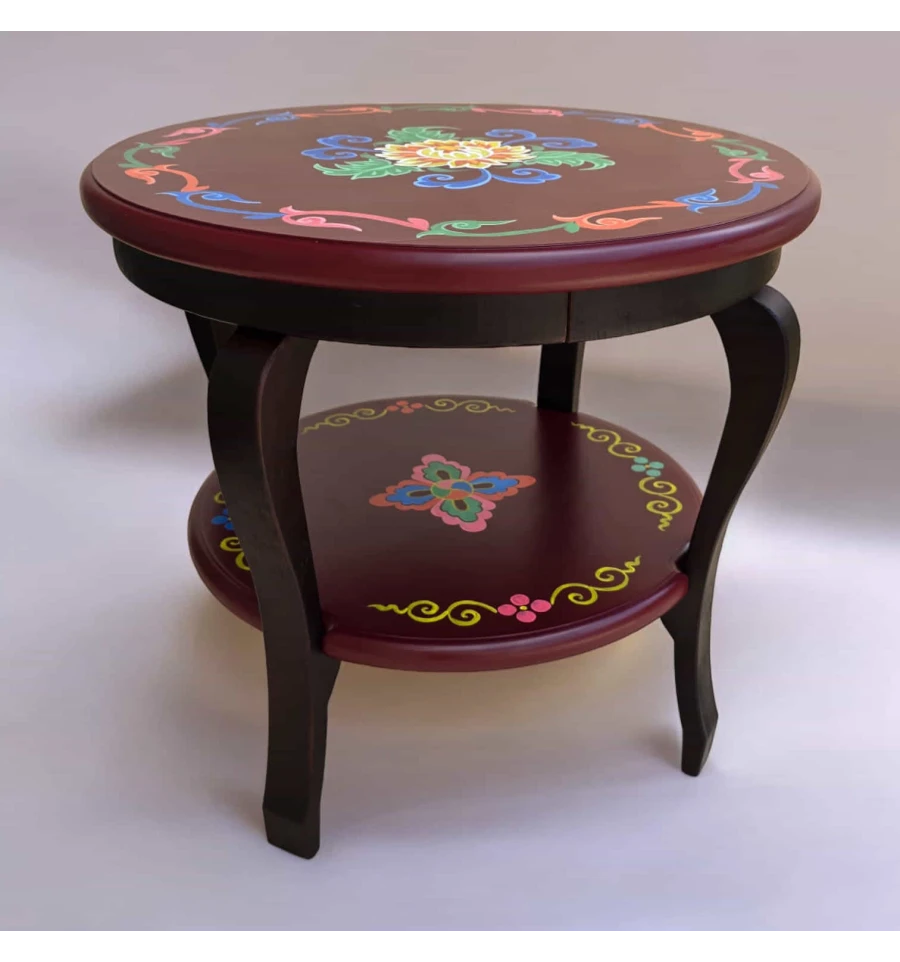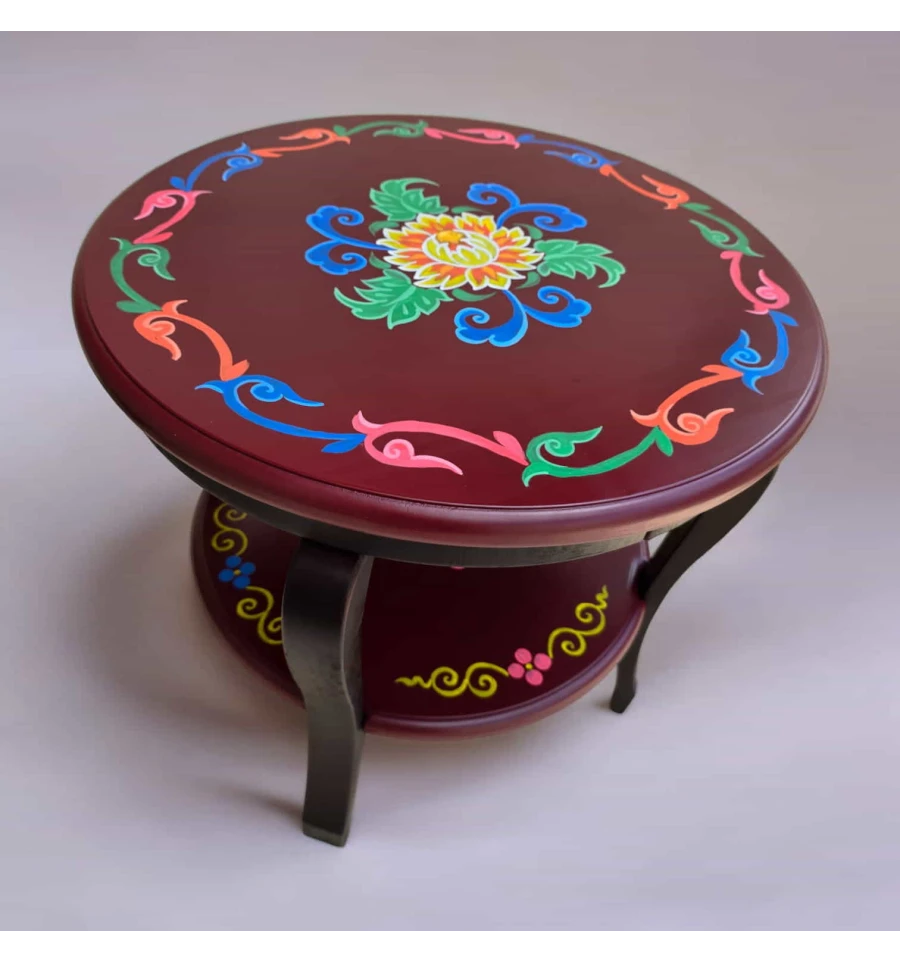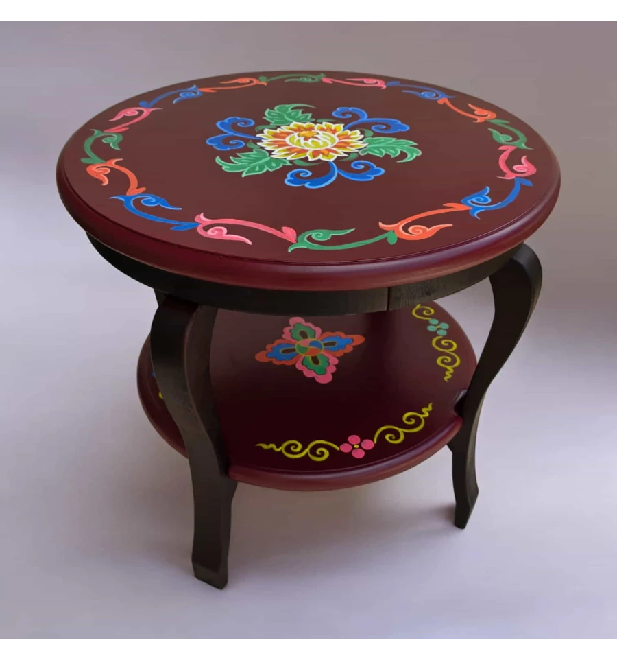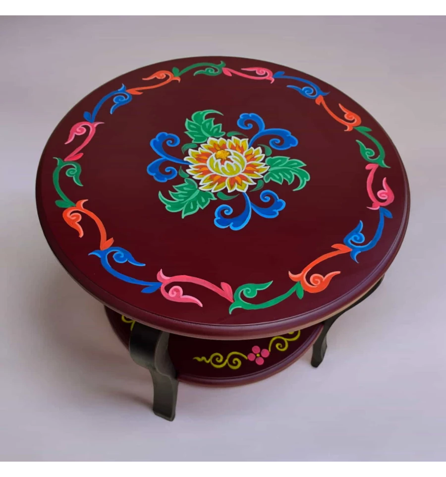 Тибетский орнамент, украшающий этот стол, является символом богатого культурного наследия Тибета. Орнамент выполнен в ярких и насыщенных цветах, которые символизируют гармонию, процветание и духовное возвышение. Центральная часть стола украшена традиционным цветком, окруженным изогнутыми линиями и декоративными элементами, символизирующими энергию и защиту.