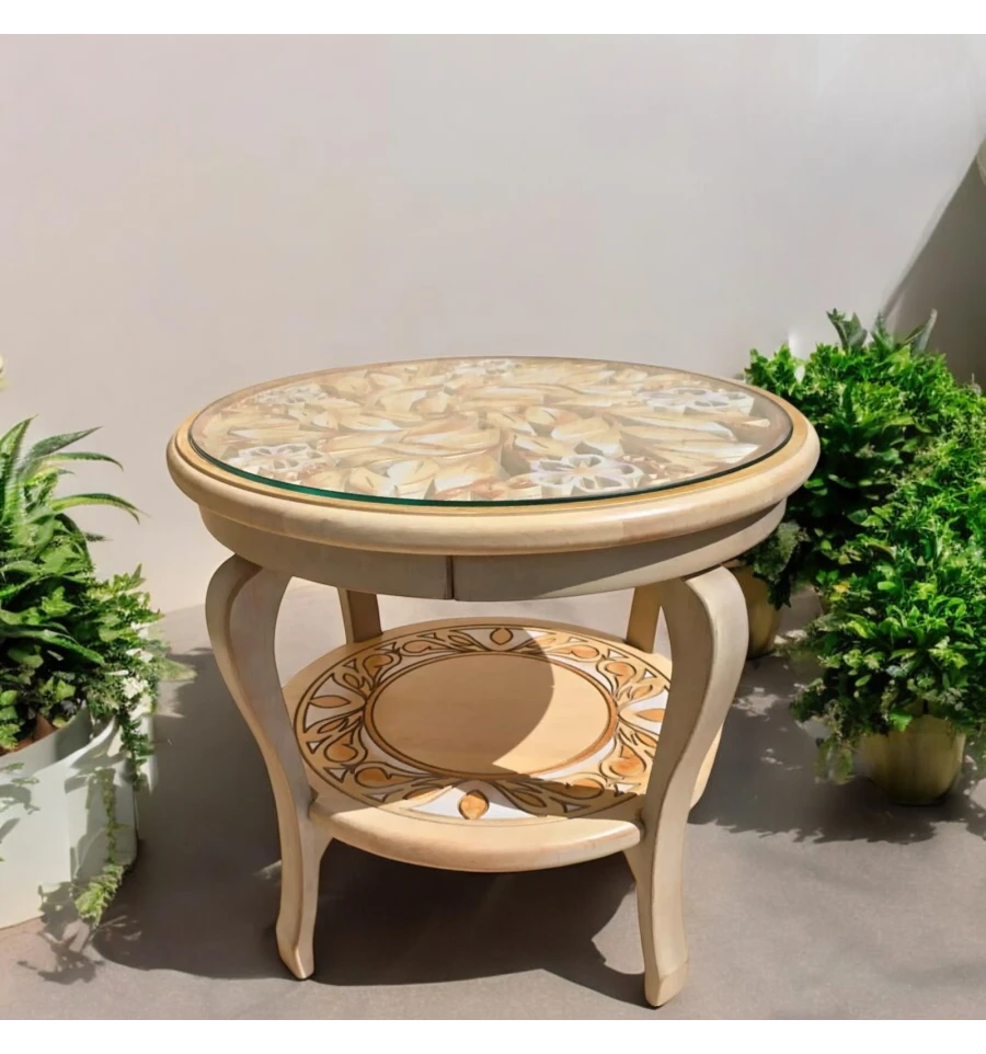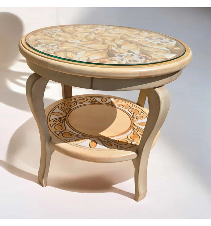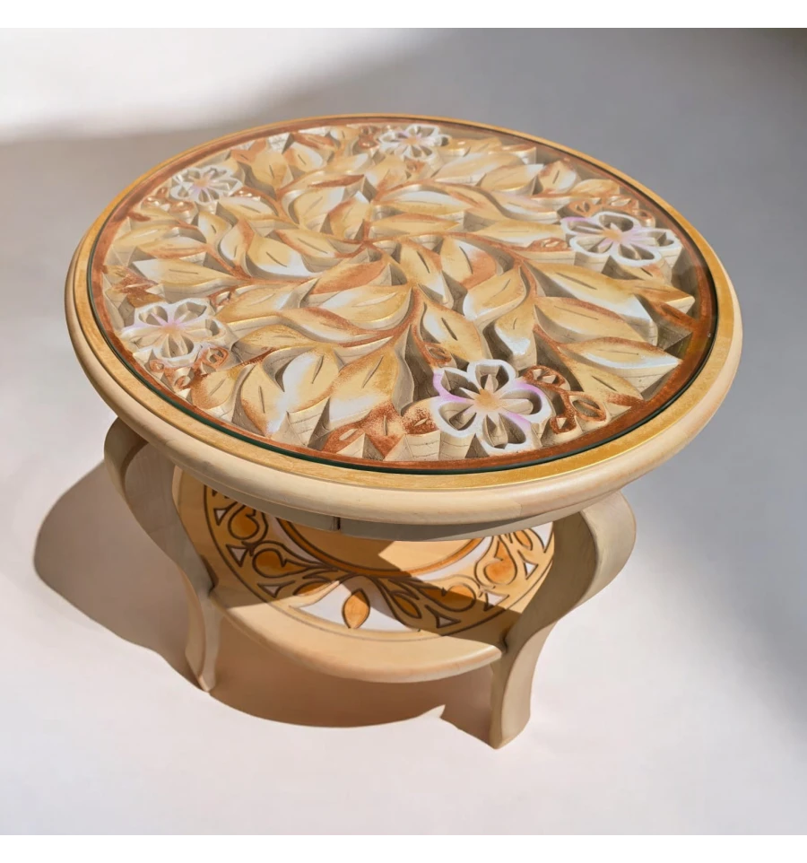 Интерьерный столик «Ванильный прованс»(d-530mm.h-480mm),массив дерева ,резной ,стекло в комплекте.