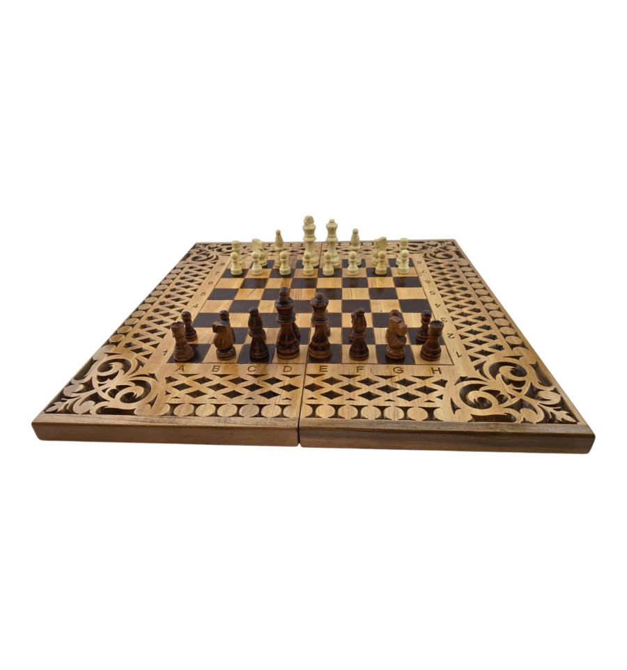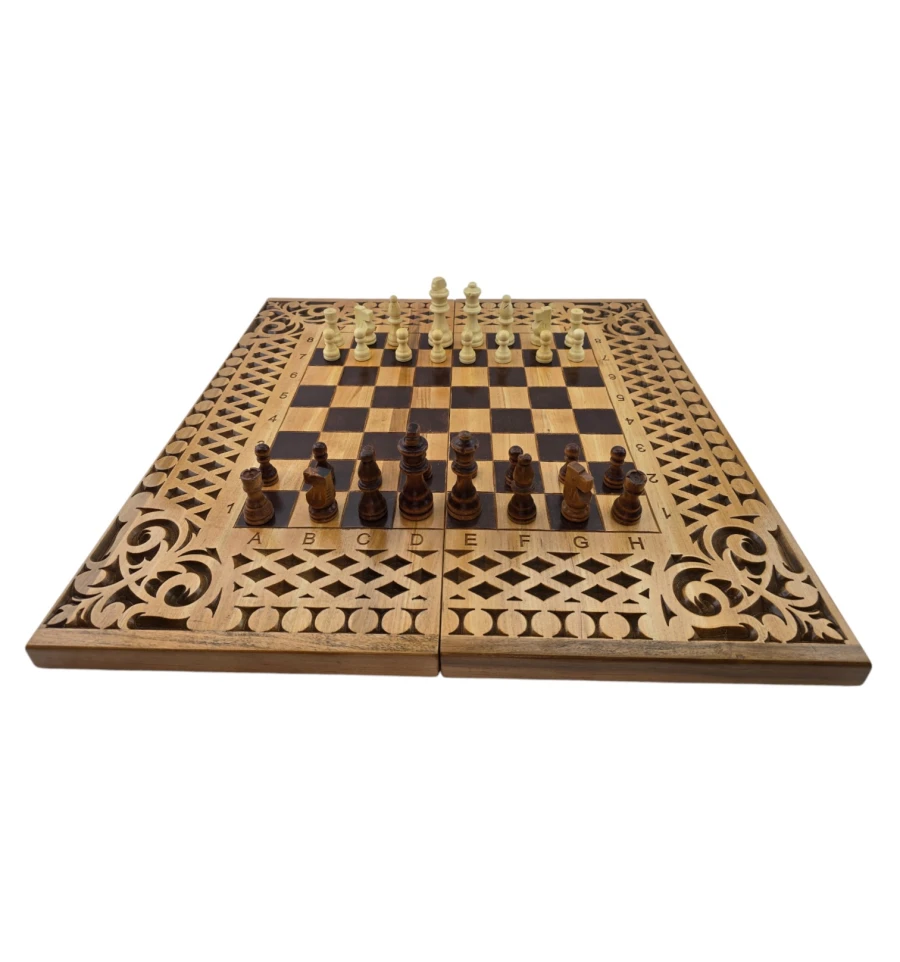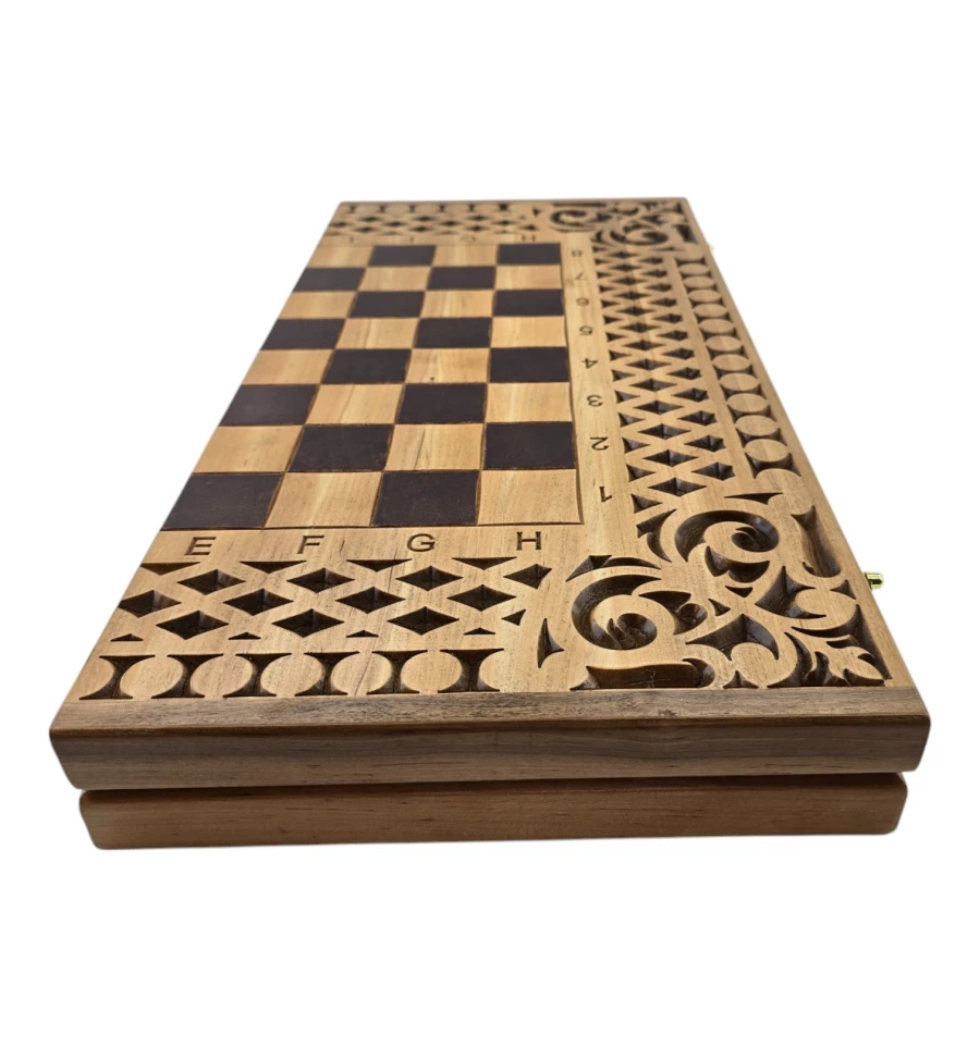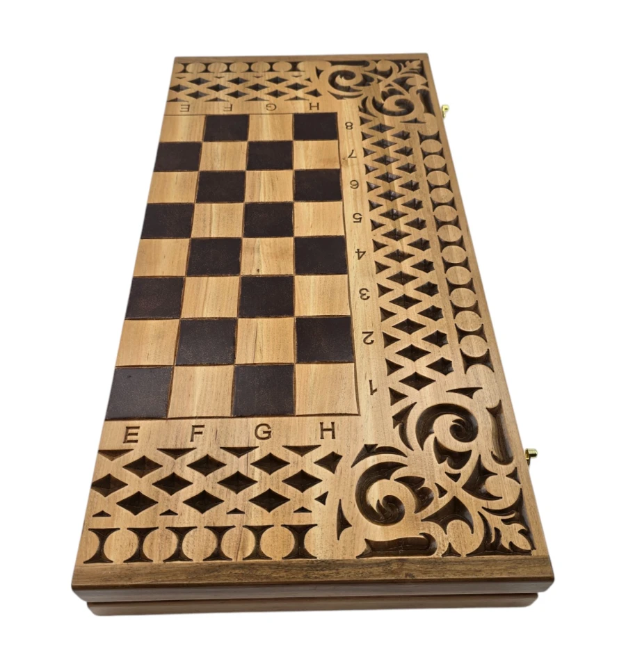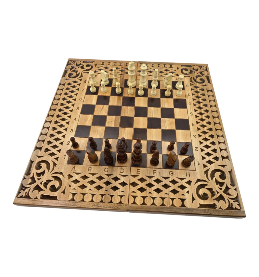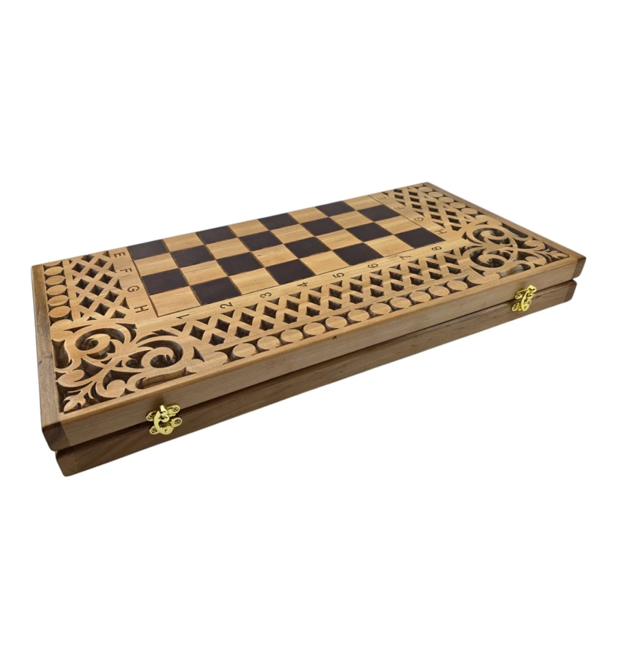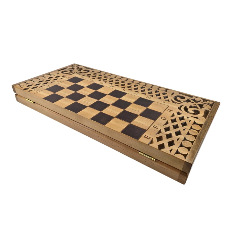 Комплектация: фигуры и фишки из того же материала, с оригинальным резным дизайном.