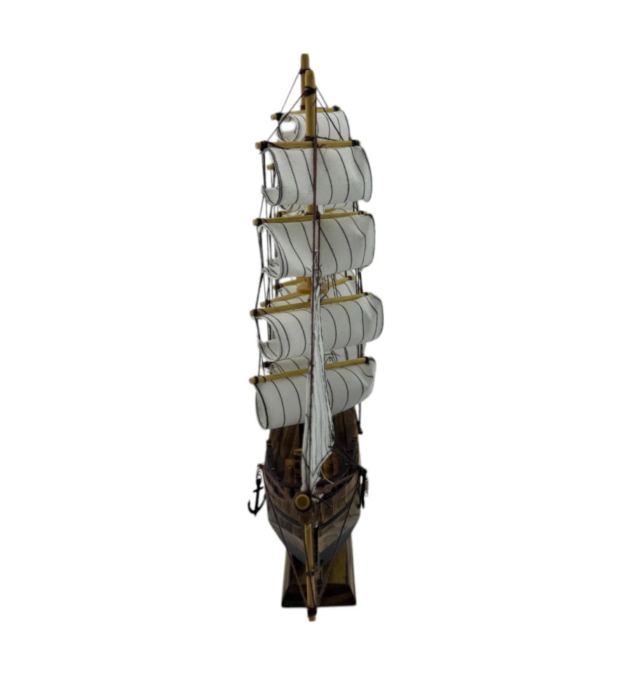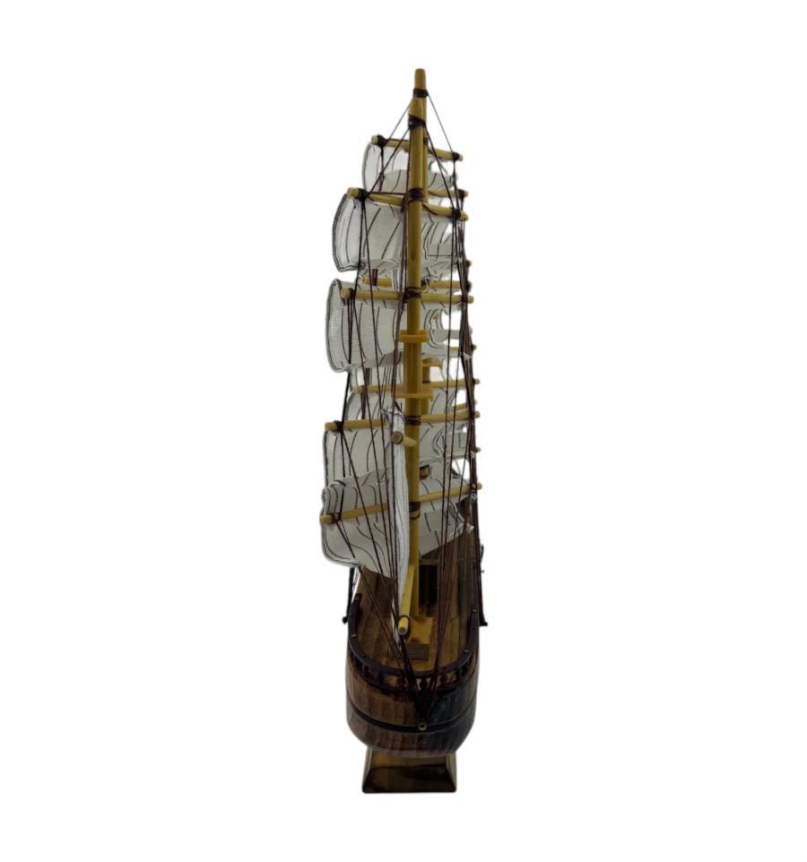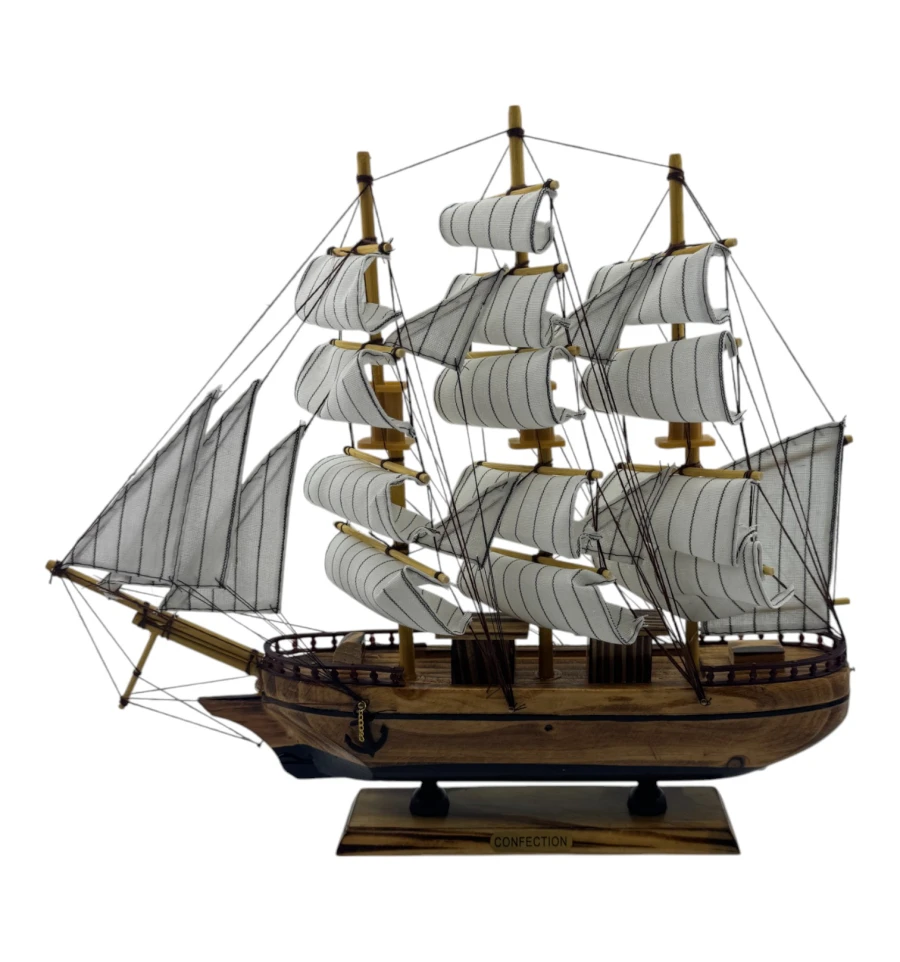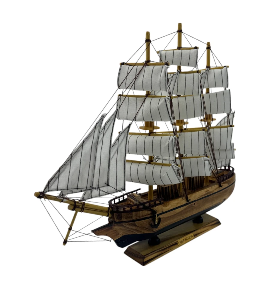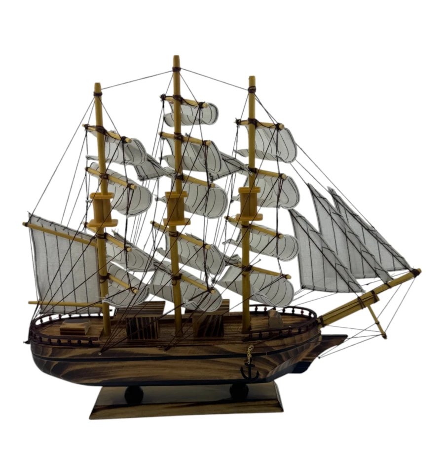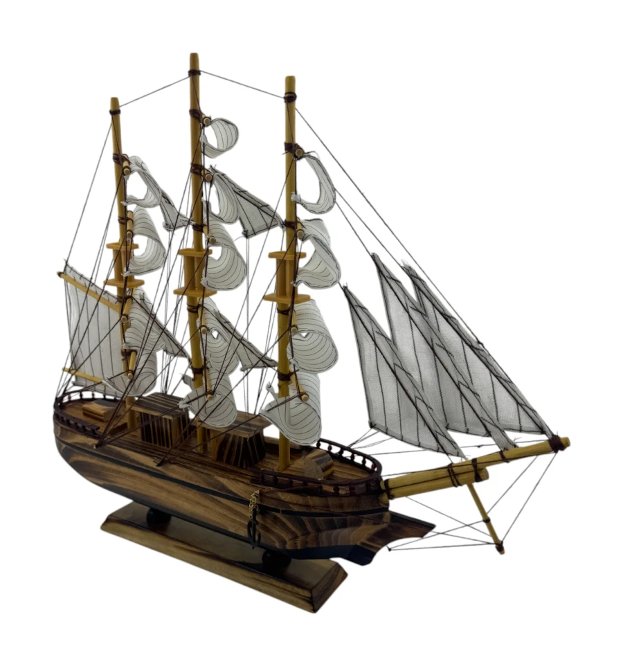 Изящные паруса и продуманные детали мачт создают ощущение лёгкости и движения, словно этот маленький кораблик готов отправиться в далёкое плавание. Модель оснащена деревянной подставкой, которая добавляет устойчивости и делает её удобной для размещения.
