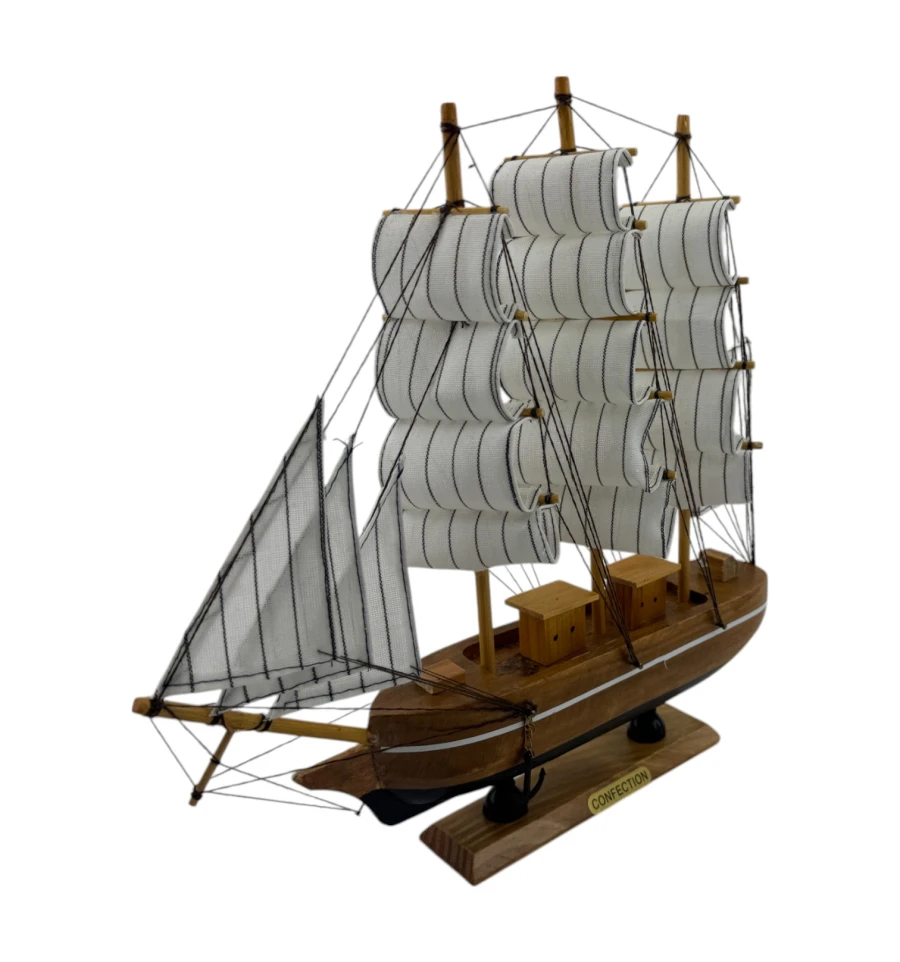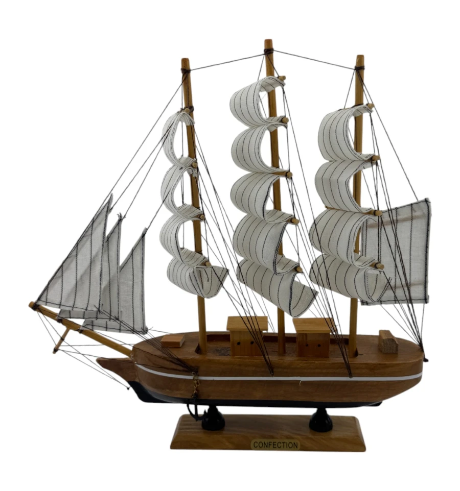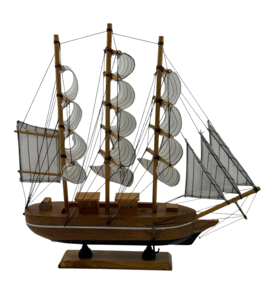 Эта очаровательная модель парусника станет стильным украшением вашего дома или рабочего пространства. Выполненная из натурального дерева и ткани, она переносит вас в эпоху великих морских путешествий. Компактный размер позволяет разместить её где угодно — на полке, столе или каминной полке, добавляя нотку романтики и духа приключений в любой интерьер.