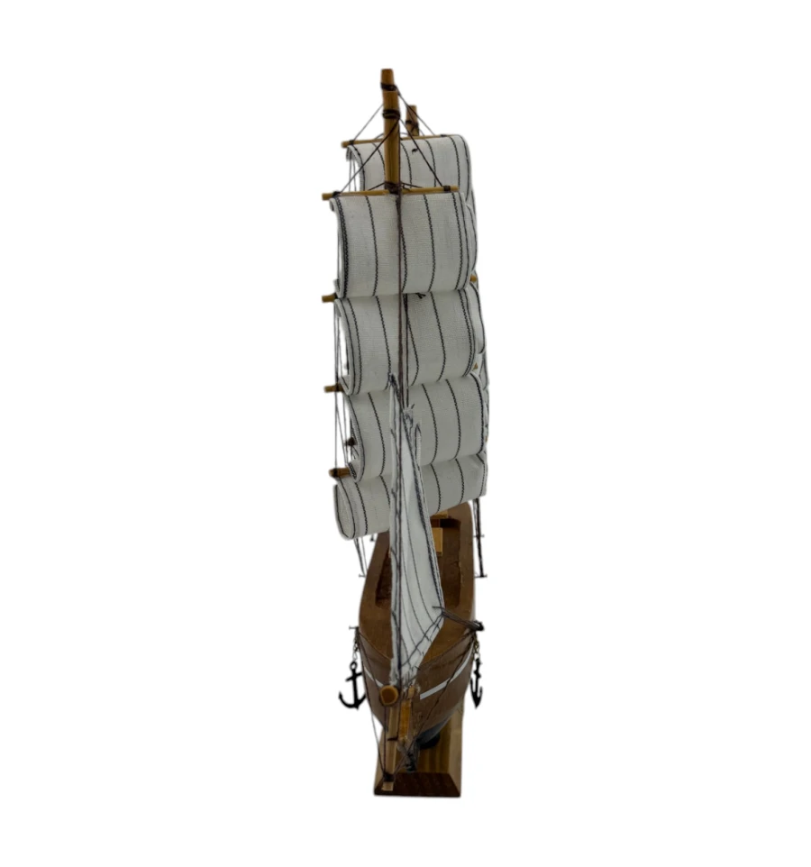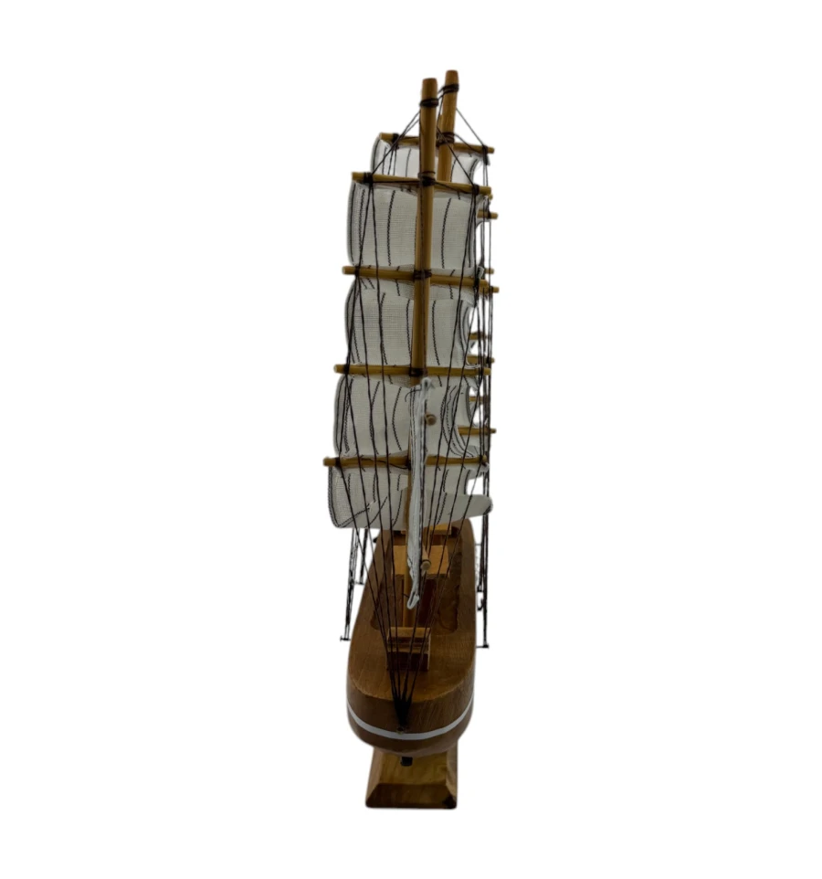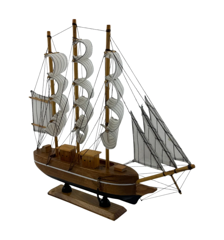 Изящные паруса и продуманные детали мачт создают ощущение лёгкости и движения, словно этот маленький кораблик готов отправиться в далёкое плавание. Модель оснащена деревянной подставкой, которая добавляет устойчивости и делает её удобной для размещения.