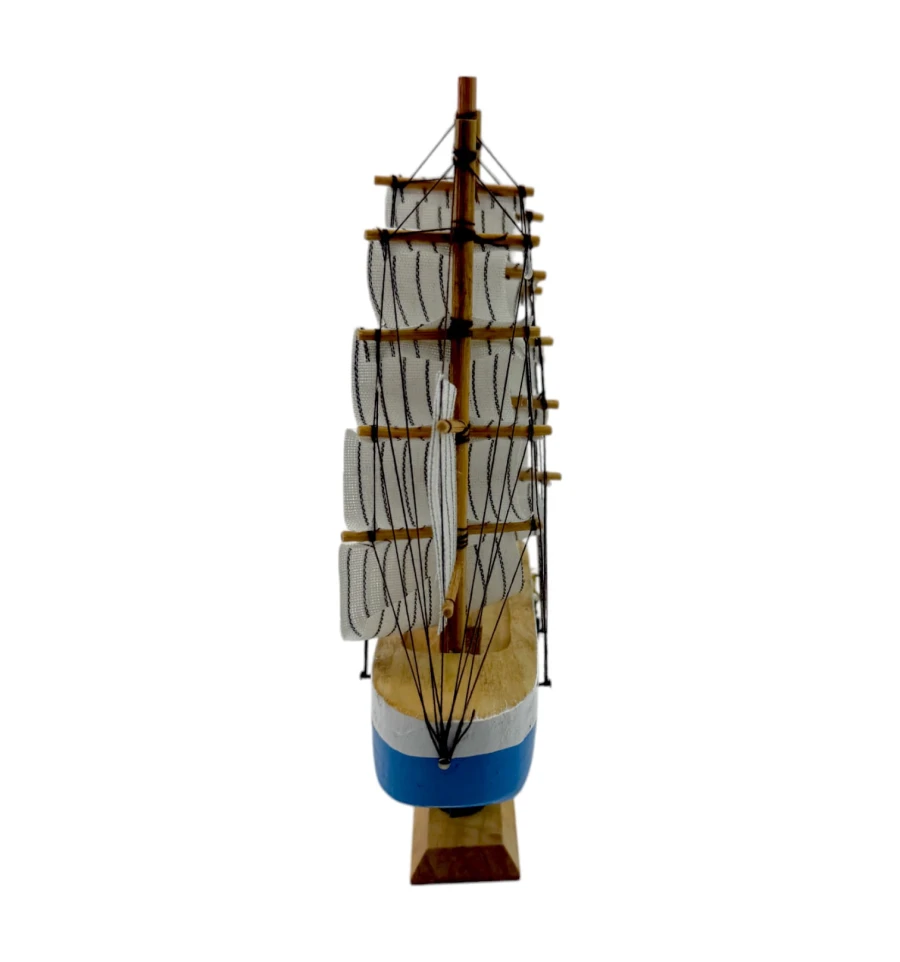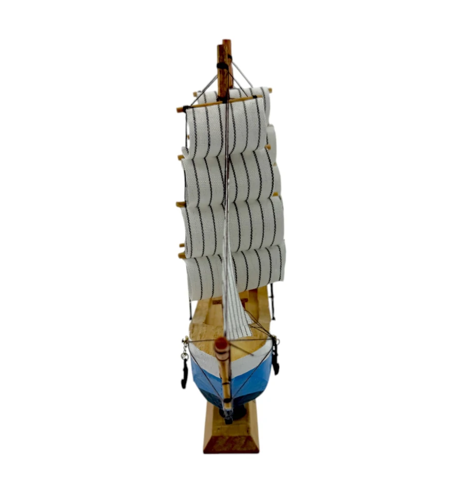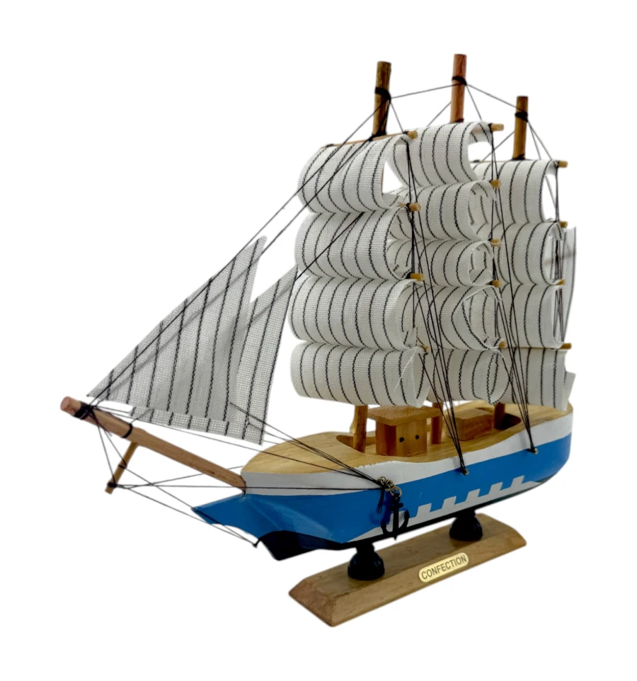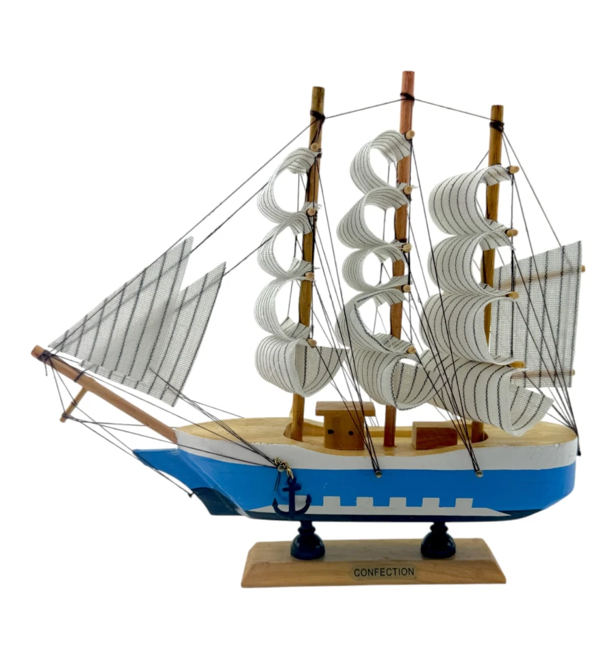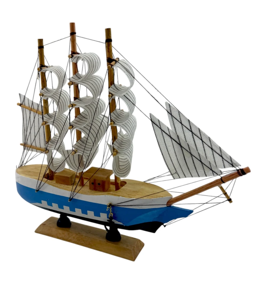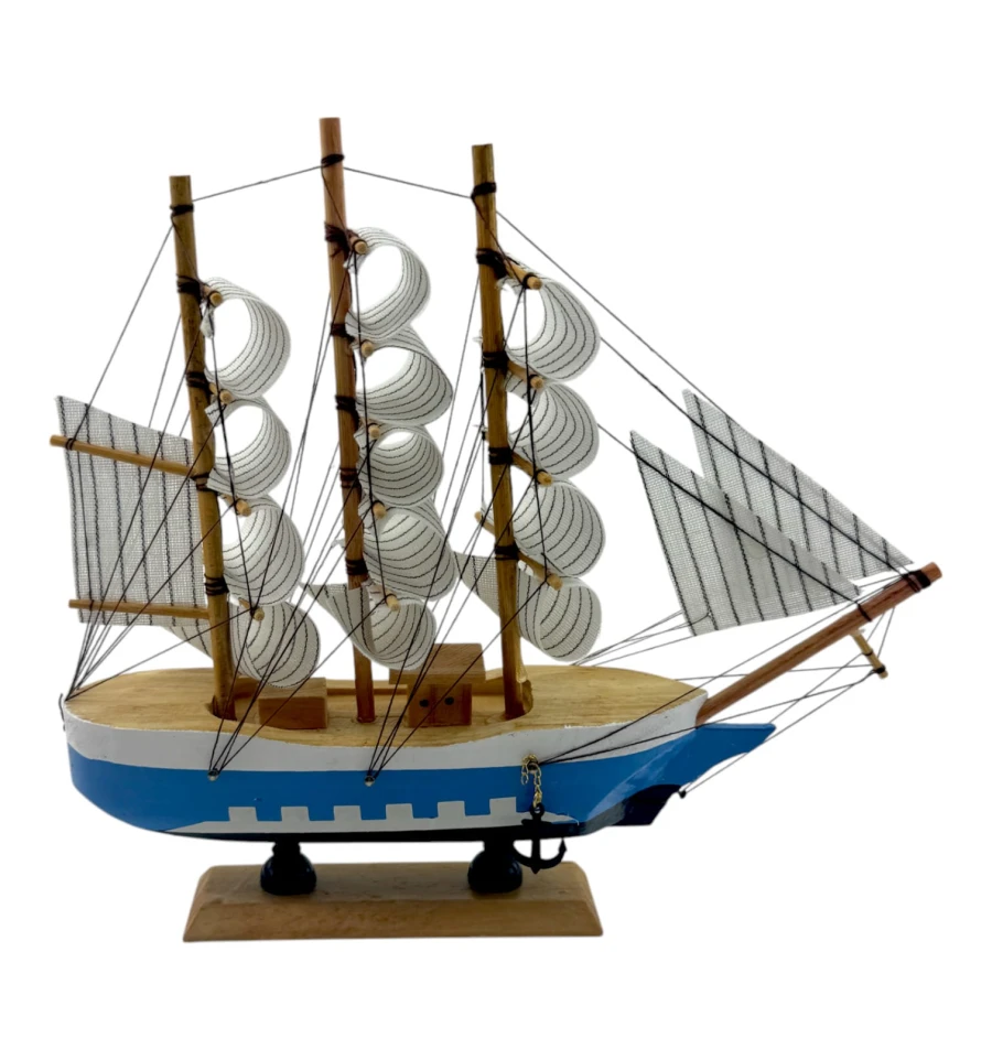 Деревянный парусник на подставке. Этот элегантный парусник - настоящий символ свободы и мечты о далеких морских путешествиях. Его деревянный корпус с синей полосой, со светлыми парусами призывает к новым горизонтам и приключениям. Парусник на подставке станет не только изысканным элементом вашего интерьера, но и напоминанием о бескрайних океанах и незабываемых моментах. Его компактные размеры делают его идеальным для размещения на столе, полке или в другом уголке вашего дома. Два якоря придают этой композиции дополнительный морской шарм и символизируют стабильность и верность своим идеалам. Этот парусник также может стать замечательным подарком для всех, кто разделяет страсть к морским темам и мечтает о приключениях на широких водах. Он символизирует свободу, мечты и бесконечные возможности. Погрузитесь в мир морской романтики с нашим парусником. Он будет напоминать вам о великих путешествиях и дарить вдохновение каждый день.