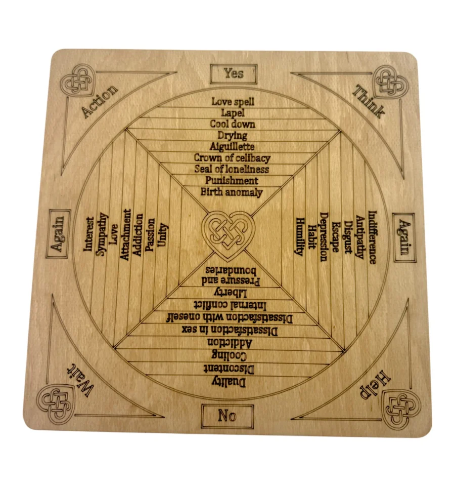 Таблица любовной магии - это инструмент для работы с маятником, который поможет определить вашу совместимость с потенциальным партнером, узнать истинные чувства, привлечь любовь или сохранить гармоничные отношения. Таблица имеет размер 26х26х0,8 см и изготовлена из дерева, покрытого льняным маслом с пчелиным воском, что придает ей натуральный вид и защищает от влаги. На таблице изображены различные символы, которые представляют различные энергии и состояния, а также инструкции для использования маятника и таблицы в работе с любовной магией. Это полезный инструмент для тех, кто интересуется магией и хочет улучшить свои отношения или привлечь новые любовные связи.