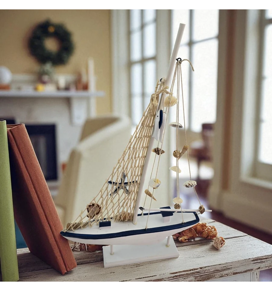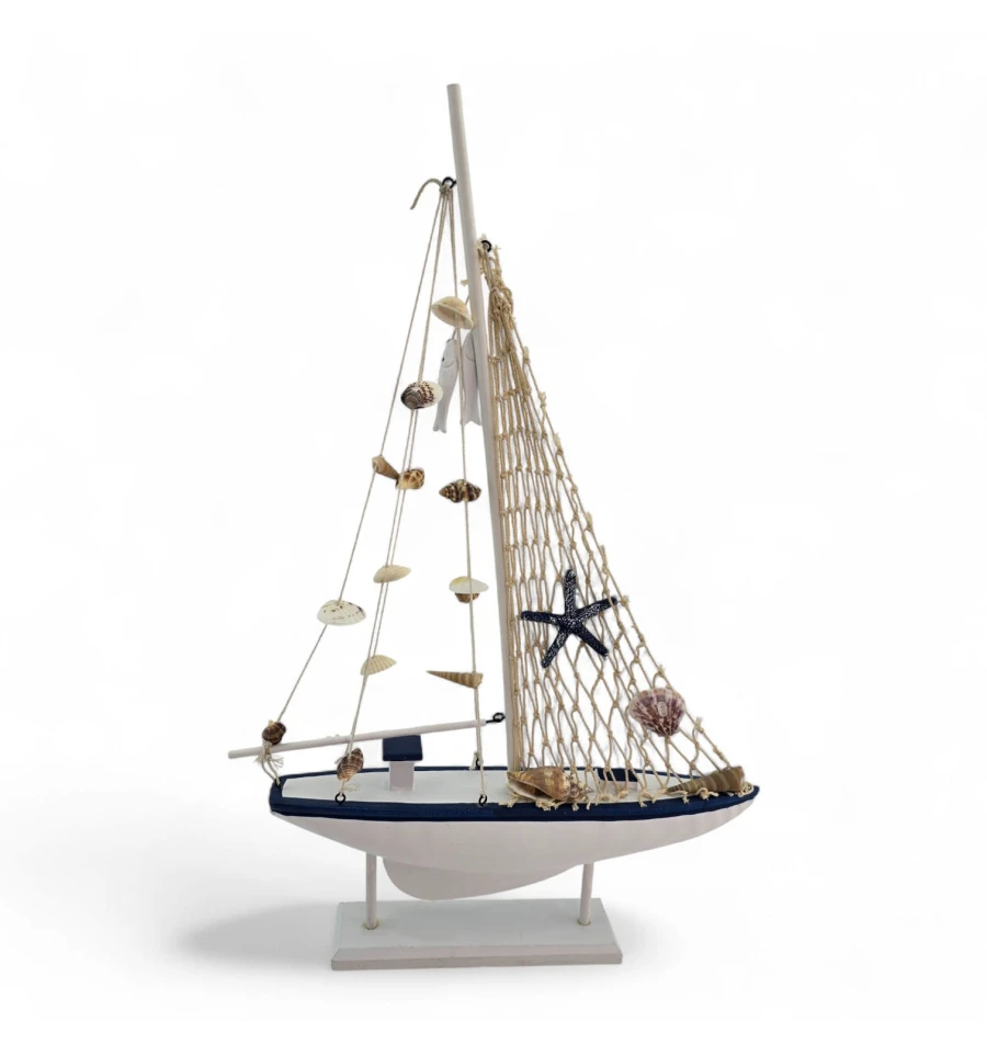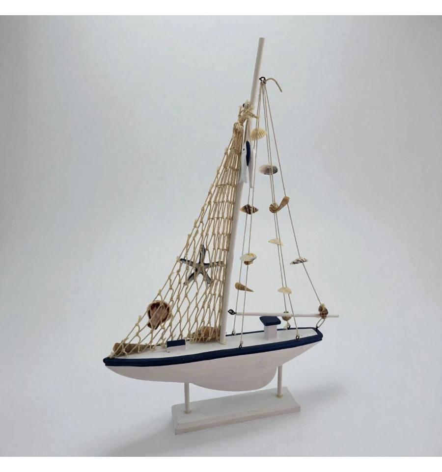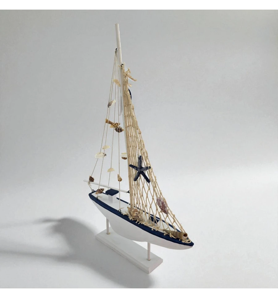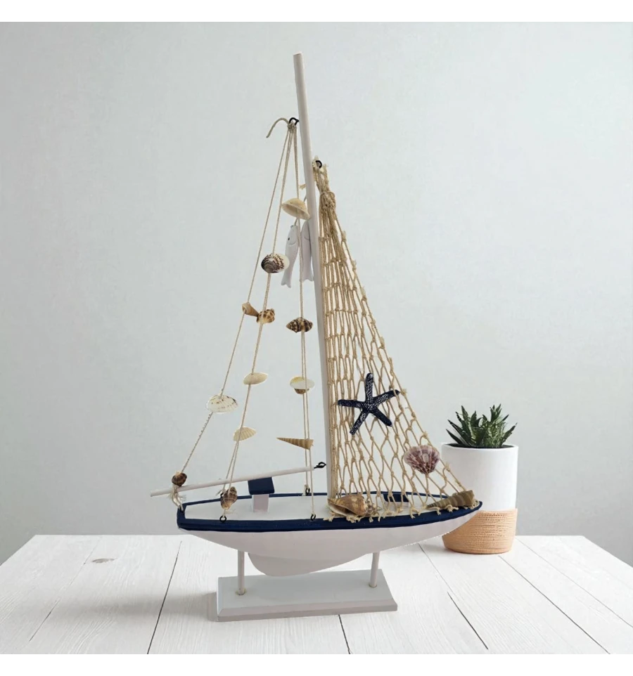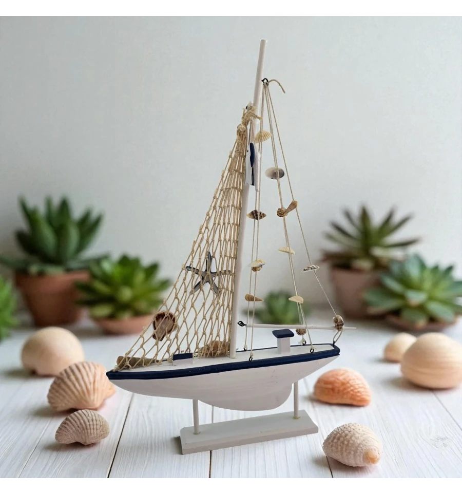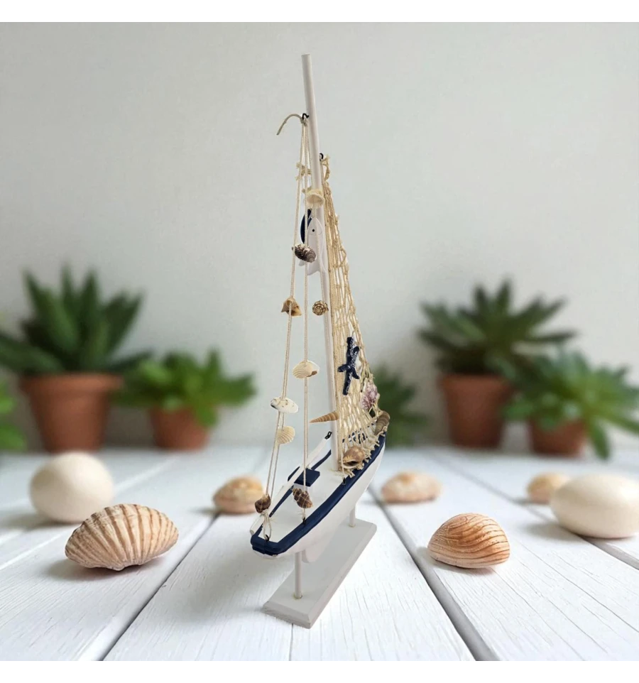 Настольный парусник в морском стиле для декора дома, кафе или фотозоны. Деревянный корпус, мачта с верёвочной сетью, подвесные натуральные ракушки и морская звезда. Устойчиво стоит на подставке, не требует монтажа. Создаёт лёгкую атмосферу моря и отдыха. Из-за природных материалов элементы могут немного отличаться от фото.