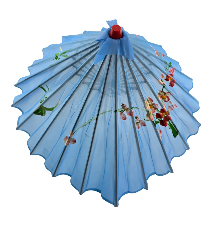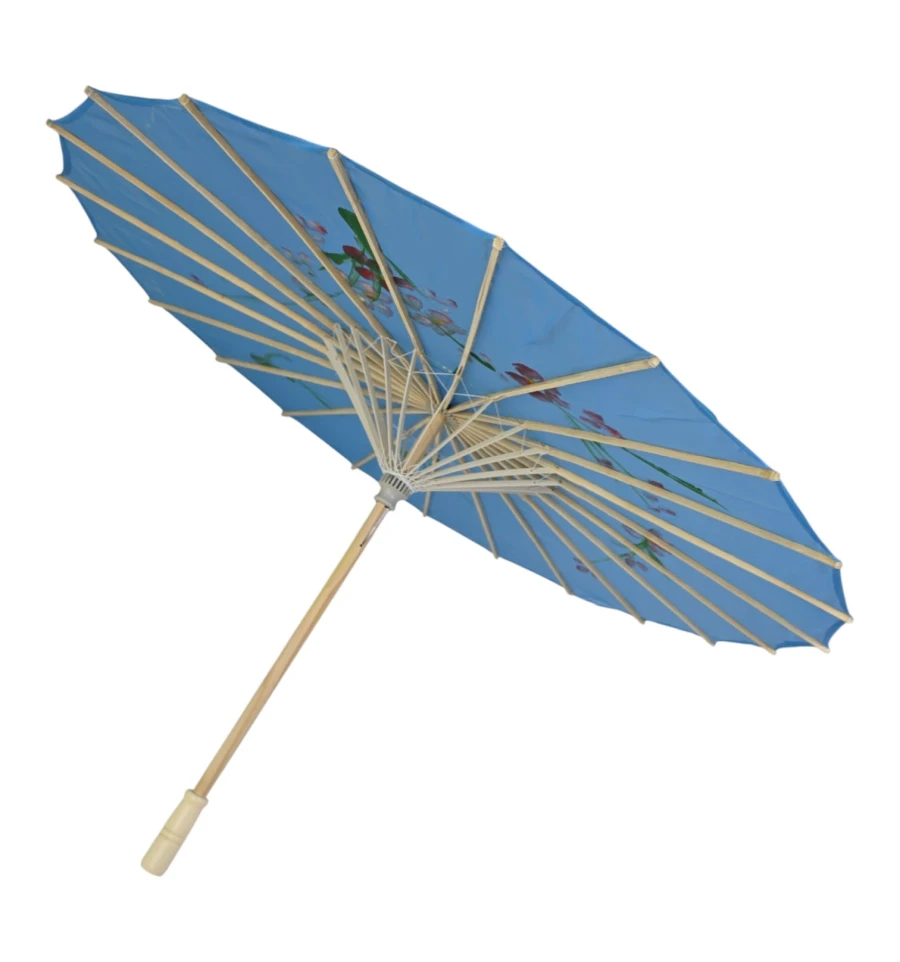 Этот удивительный зонтик представляет собой воплощение изысканности и традиций. Он изготовлен из легкого и прочного бамбука, который придает ему невесомость и естественную красоту. Покрытие из натурального шелка, голубого цвета, добавляет изысканности и придает этому зонтику уникальный внешний вид.