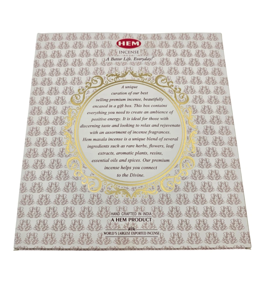 Подарочный набор индийских масала-благовоний от HEM для дома, релакса и медитации. В комплекте пять коробок аромапалочек по 15 г каждая и мини-подставка. Благовония скручены вручную из растительных компонентов и эфирных масел. Подожгите кончик палочки, дайте огню разгореться 5–10 секунд, задуйте и установите в подставку. Используйте в хорошо проветриваемом помещении, держите вдали от детей и животных.